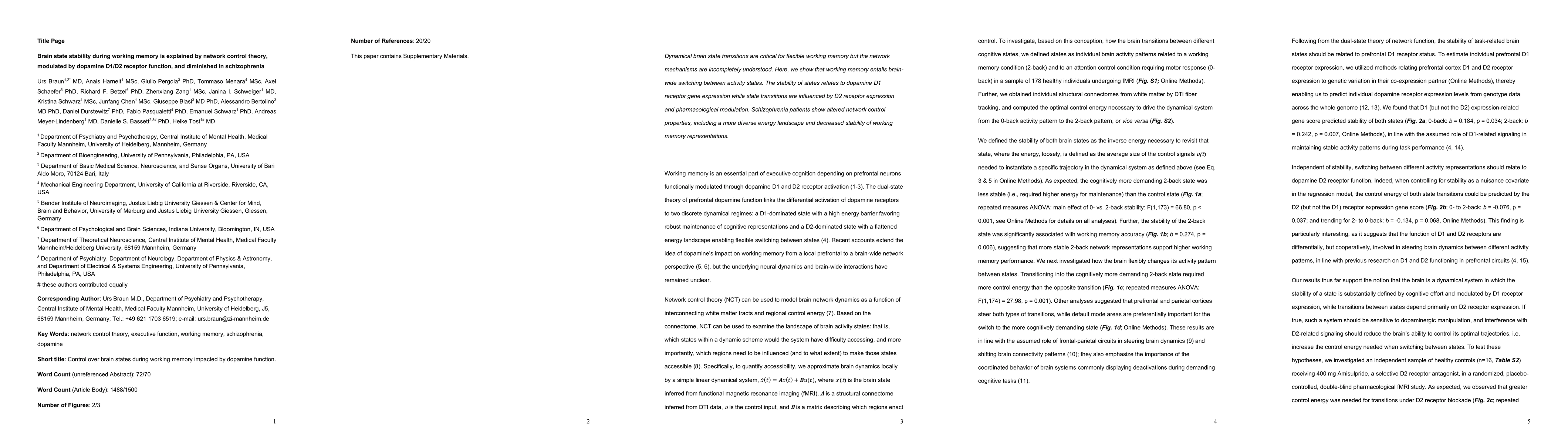 This study reveals that brainwide transitions between activity states underpin working memory stability, modulated by dopamine D1/D2 receptor functions. Schizophrenia patients exhibit altered network control properties, with decreased stability of working memory representations.