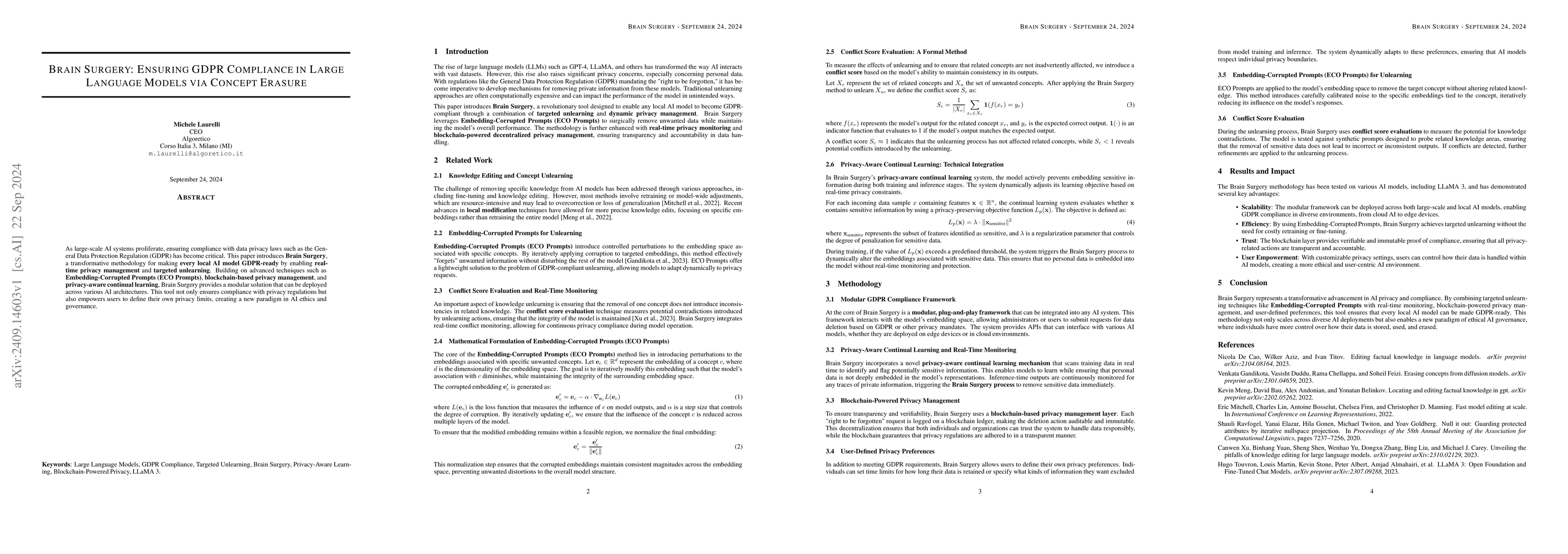 This paper presents Brain Surgery, a methodology for ensuring GDPR compliance in large language models through real-time privacy management and targeted unlearning, leveraging techniques like ECO Prompts and blockchain-based privacy management to create a modular, adaptable solution for AI ethics and governance.