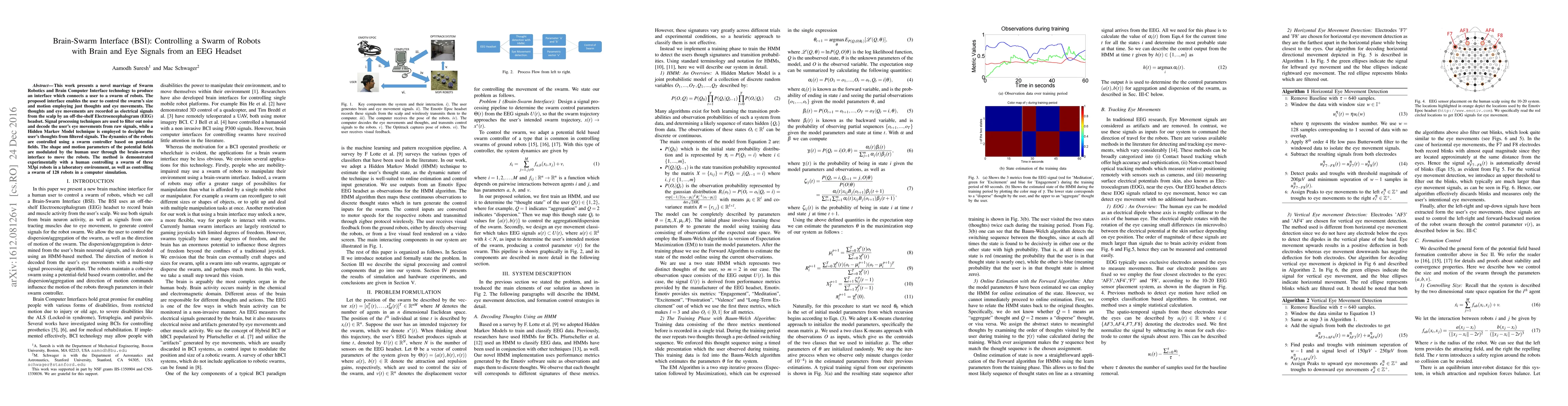 This paper introduces a Brain-Swarm Interface (BSI) that allows users to control a swarm of robots using EEG headset signals for thoughts and eye movements, employing signal processing and Hidden Markov Models for decoding, and potential fields for robot dynamics. Experimental results show successful control of both small and large robot swarms.