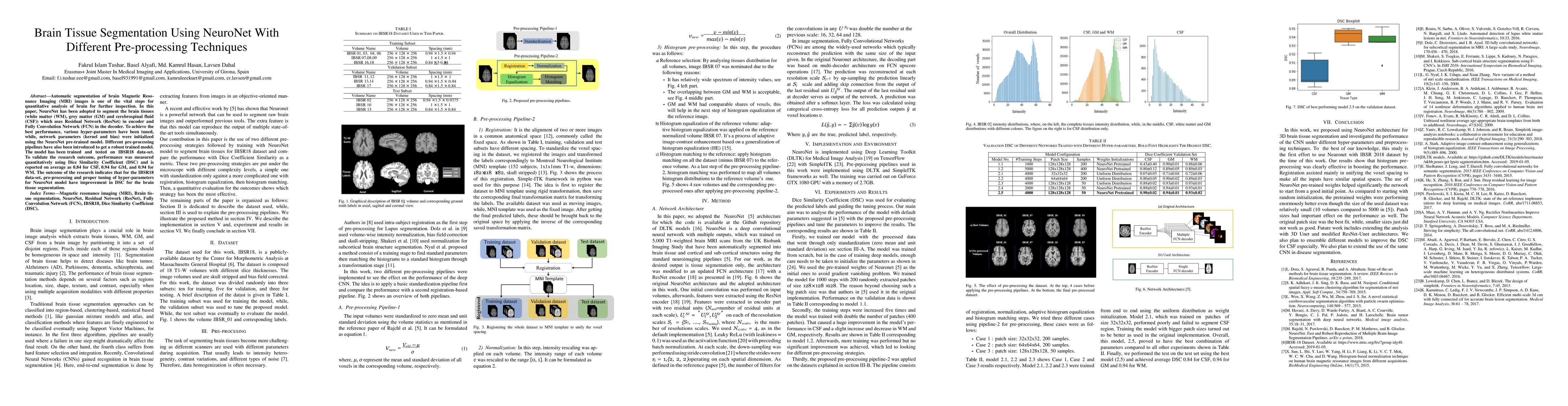 This paper explores the use of NeuroNet, incorporating ResNet and FCN, for automatic segmentation of brain tissues in MRI images. Various pre-processing techniques and hyper-parameter tuning were employed to enhance model performance, achieving a Dice Similarity Coefficient of 0.84 for CSF, and 0.94 for both GM and WM, indicating significant improvements through pre-processing.