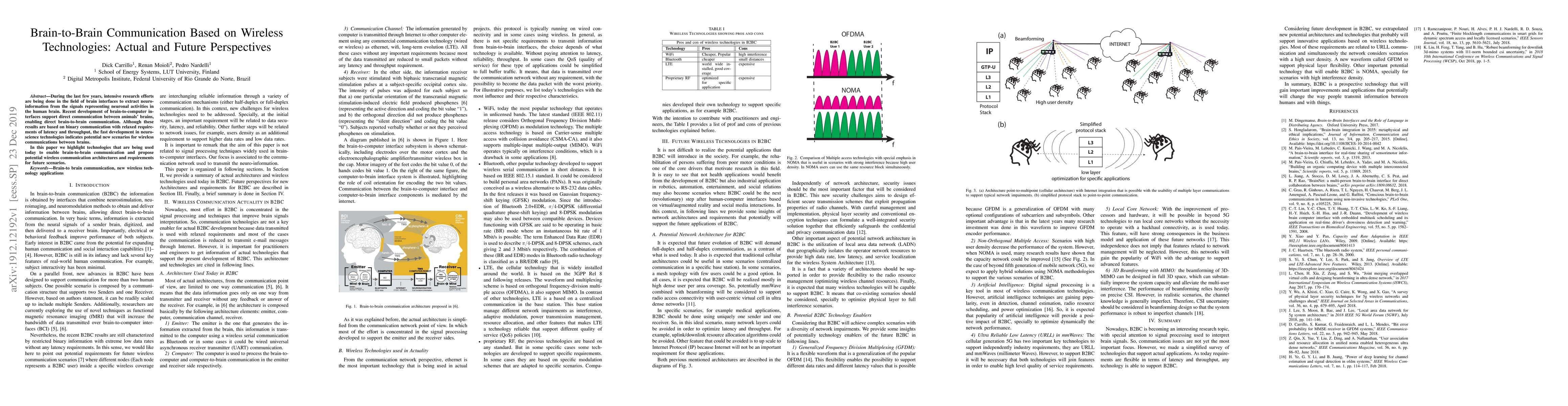 During the last few years, intensive research efforts are being done in the field of brain interfaces to extract neuro-information from the signals representing neuronal activities in the human brain. Recent development of brain-to-computer interfaces support direct communication between animals' brains, enabling direct brain-to-brain communication. Although these results are based on binary communication with relaxed requirements of latency and throughput, the fast development in neuro-science technologies indicates potential new scenarios for wireless communications between brains. In this paper we highlight technologies that are being used today to enable brain-to-brain communication and propose potential wireless communication architectures and requirements for future scenarios.