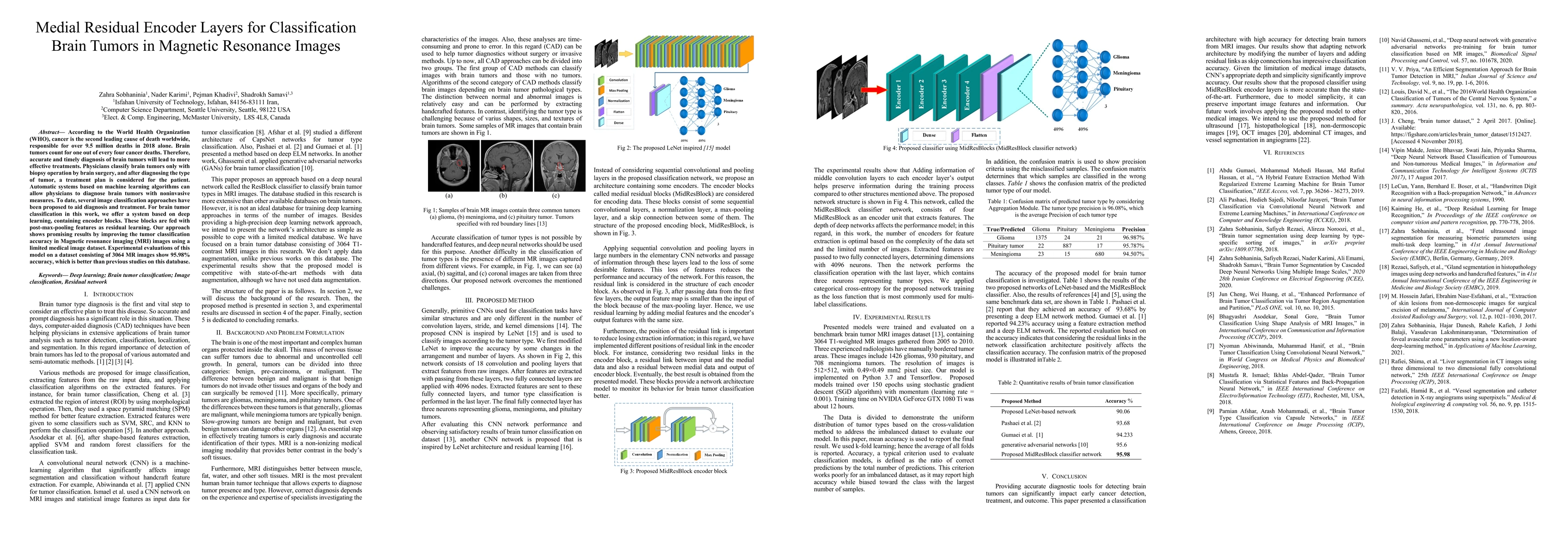 The research proposes a deep learning system for brain tumor classification using medial residual encoder layers. The system is trained on a dataset of 3064 T1-weighted MR images, with manual tumor segmentation by three radiologists. The proposed architecture, MidResBlock classifier network, consists of four encoder units (MidResBlock) followed by two fully connected layers for classification.