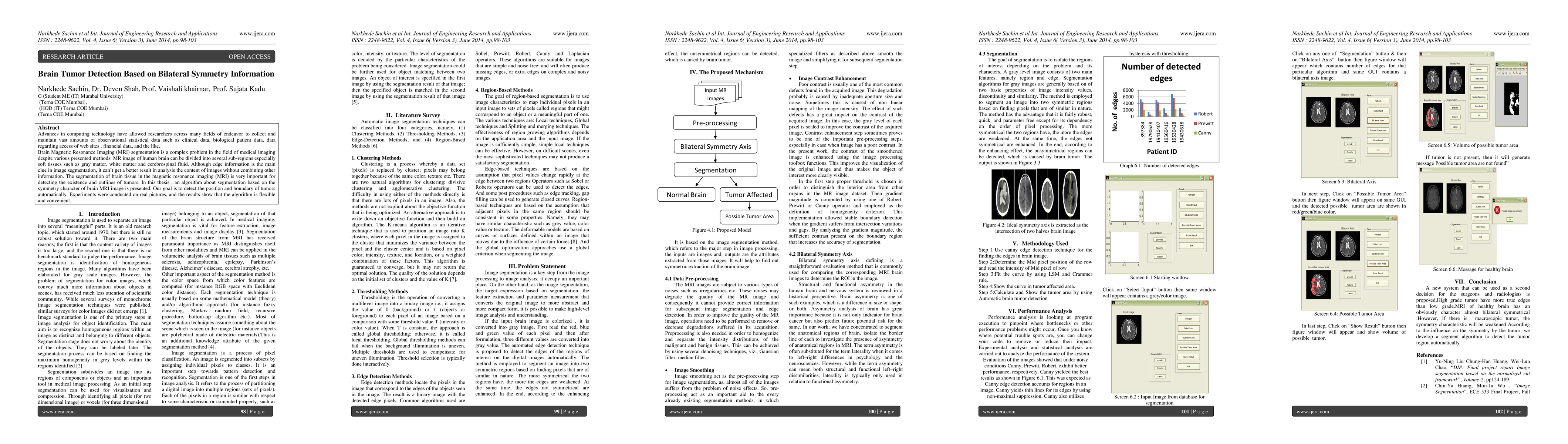 Advances in computing technology have allowed researchers across many fields of endeavor to collect and maintain vast amounts of observational statistical data such as clinical data,biological patient data,data regarding access of web sites,financial data,and the like.Brain Magnetic Resonance Imaging(MRI)segmentation is a complex problem in the field of medical imaging despite various presented methods.MR image of human brain can be divided into several sub regions especially soft tissues such as gray matter,white matter and cerebrospinal fluid.Although edge information is the main clue in image segmentation,it can not get a better result in analysis the content of images without combining other information.The segmentation of brain tissue in the magnetic resonance imaging(MRI)is very important for detecting the existence and outlines of tumors.In this paper,an algorithm about segmentation based on the symmetry character of brain MRI image is presented.Our goal is to detect the position and boundary of tumors automatically.Experiments were conducted on real pictures,and the results show that the algorithm is flexible and convenient.