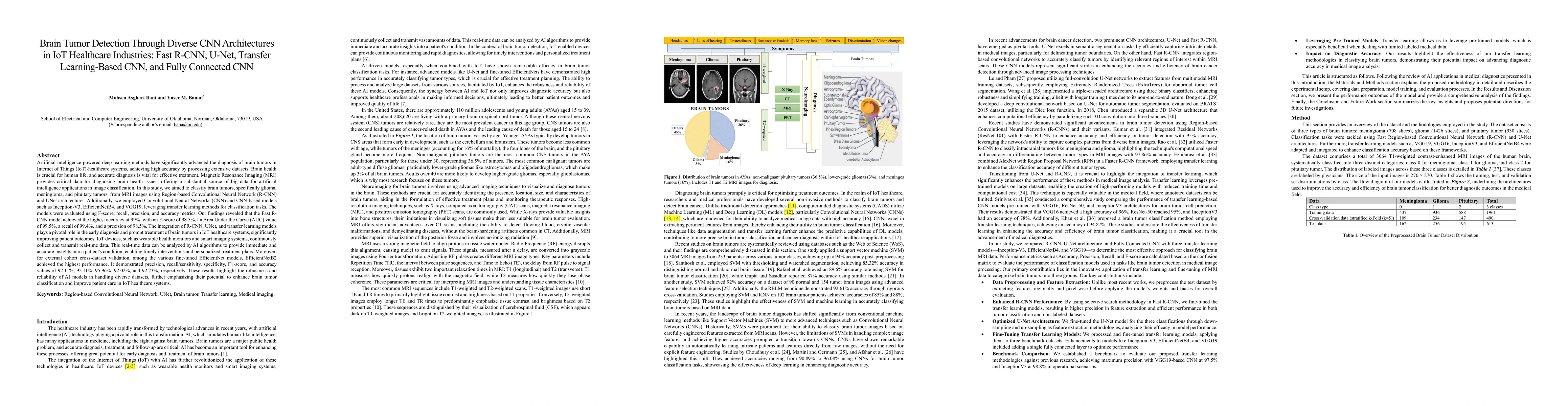 Artificial intelligence (AI)-powered deep learning has advanced brain tumor diagnosis in Internet of Things (IoT)-healthcare systems, achieving high accuracy with large datasets. Brain health is critical to human life, and accurate diagnosis is essential for effective treatment. Magnetic Resonance Imaging (MRI) provides key data for brain tumor detection, serving as a major source of big data for AI-driven image classification. In this study, we classified glioma, meningioma, and pituitary tumors from MRI images using Region-based Convolutional Neural Network (R-CNN) and UNet architectures. We also applied Convolutional Neural Networks (CNN) and CNN-based transfer learning models such as Inception-V3, EfficientNetB4, and VGG19. Model performance was assessed using F-score, recall, precision, and accuracy. The Fast R-CNN achieved the best results with 99% accuracy, 98.5% F-score, 99.5% Area Under the Curve (AUC), 99.4% recall, and 98.5% precision. Combining R-CNN, UNet, and transfer learning enables earlier diagnosis and more effective treatment in IoT-healthcare systems, improving patient outcomes. IoT devices such as wearable monitors and smart imaging systems continuously collect real-time data, which AI algorithms analyze to provide immediate insights for timely interventions and personalized care. For external cohort cross-dataset validation, EfficientNetB2 achieved the strongest performance among fine-tuned EfficientNet models, with 92.11% precision, 92.11% recall/sensitivity, 95.96% specificity, 92.02% F1-score, and 92.23% accuracy. These findings underscore the robustness and reliability of AI models in handling diverse datasets, reinforcing their potential to enhance brain tumor classification and patient care in IoT healthcare environments.