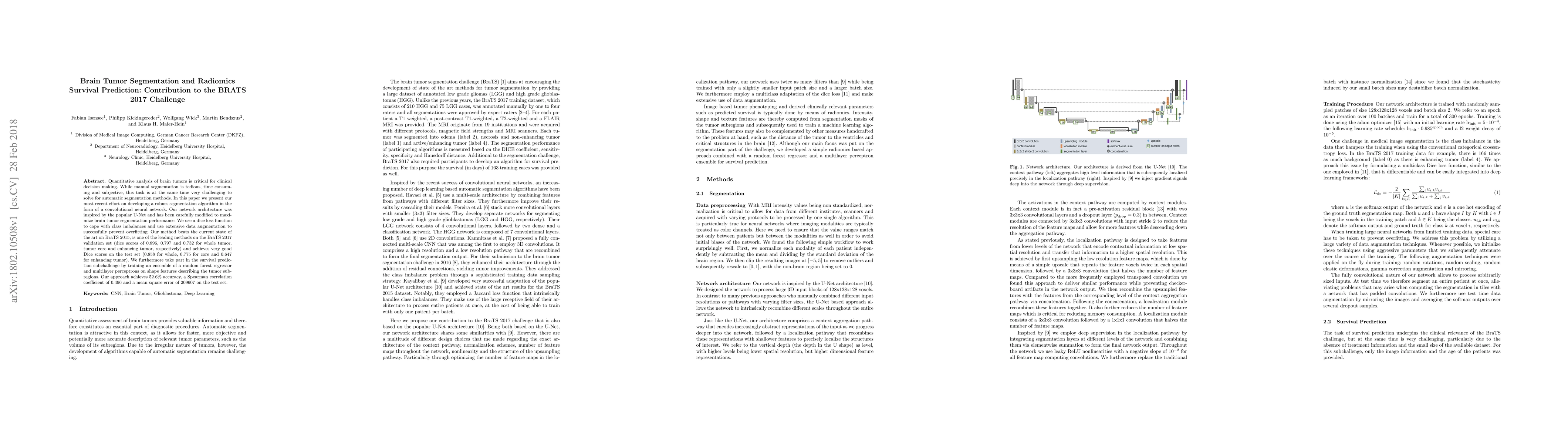 This paper presents a convolutional neural network for brain tumor segmentation, inspired by the U-Net architecture, which achieves state-of-the-art performance on the BRATS 2017 challenge. The method also includes an ensemble model for survival prediction using tumor shape features, achieving notable accuracy and correlation.