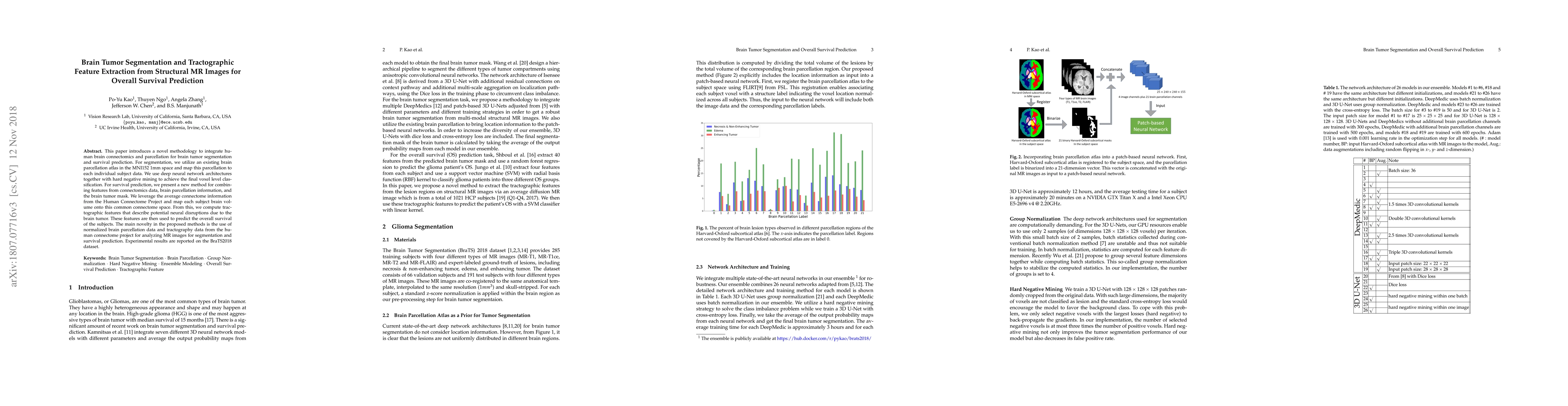 This paper proposes a novel method combining brain parcellation and tractography data to segment brain tumors and predict overall survival, utilizing deep neural networks and features from the Human Connectome Project. Experimental results on the BraTS2018 dataset demonstrate the effectiveness of the approach.