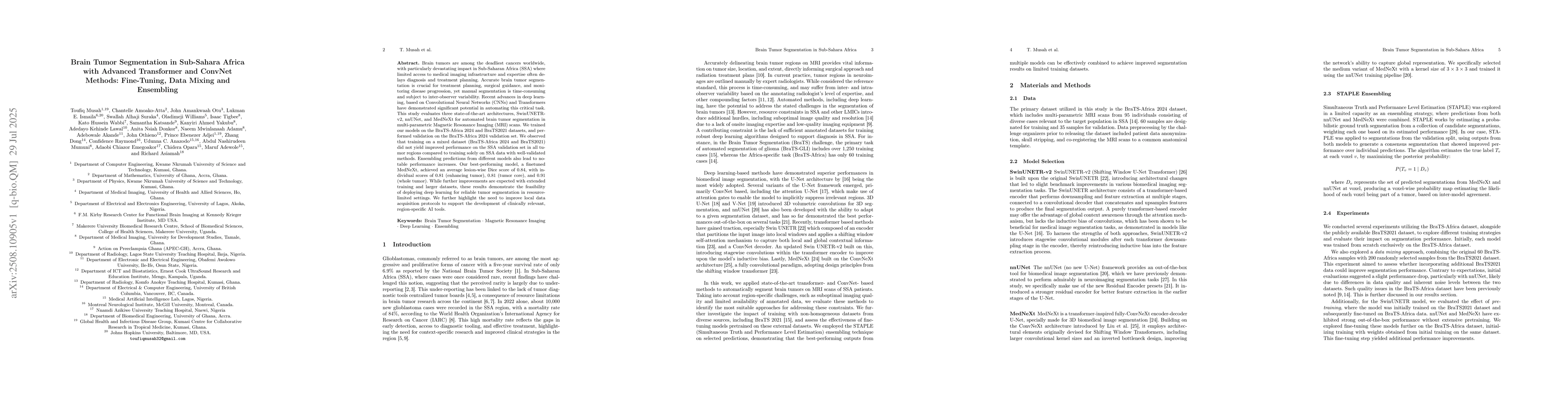 Brain tumors are among the deadliest cancers worldwide, with particularly devastating impact in Sub-Saharan Africa (SSA) where limited access to medical imaging infrastructure and expertise often delays diagnosis and treatment planning. Accurate brain tumor segmentation is crucial for treatment planning, surgical guidance, and monitoring disease progression, yet manual segmentation is time-consuming and subject to inter-observer variability. Recent advances in deep learning, based on Convolutional Neural Networks (CNNs) and Transformers have demonstrated significant potential in automating this critical task. This study evaluates three state-of-the-art architectures, SwinUNETR-v2, nnUNet, and MedNeXt for automated brain tumor segmentation in multi-parametric Magnetic Resonance Imaging (MRI) scans. We trained our models on the BraTS-Africa 2024 and BraTS2021 datasets, and performed validation on the BraTS-Africa 2024 validation set. We observed that training on a mixed dataset (BraTS-Africa 2024 and BraTS2021) did not yield improved performance on the SSA validation set in all tumor regions compared to training solely on SSA data with well-validated methods. Ensembling predictions from different models also lead to notable performance increases. Our best-performing model, a finetuned MedNeXt, achieved an average lesion-wise Dice score of 0.84, with individual scores of 0.81 (enhancing tumor), 0.81 (tumor core), and 0.91 (whole tumor). While further improvements are expected with extended training and larger datasets, these results demonstrate the feasibility of deploying deep learning for reliable tumor segmentation in resource-limited settings. We further highlight the need to improve local data acquisition protocols to support the development of clinically relevant, region-specific AI tools.
