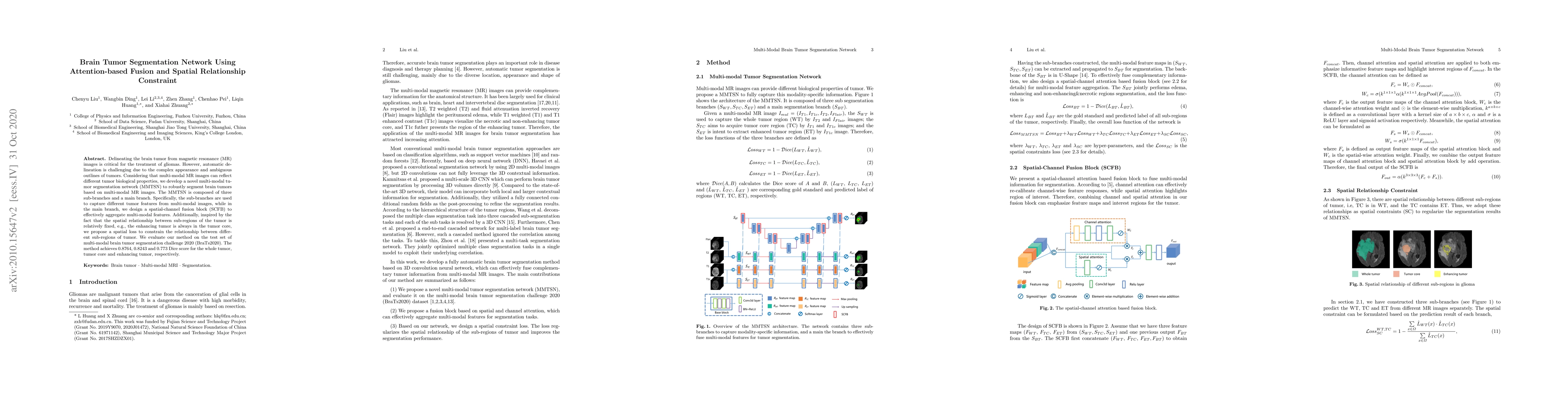 This paper presents a multi-modal tumor segmentation network (MMTSN) that uses attention-based fusion and spatial relationship constraints to segment brain tumors from MR images. The network achieves high segmentation accuracy with dice scores of 0.8764, 0.8243, and 0.773 for whole tumor, tumor core, and enhancing tumor, respectively, on the BraTS2020 dataset.