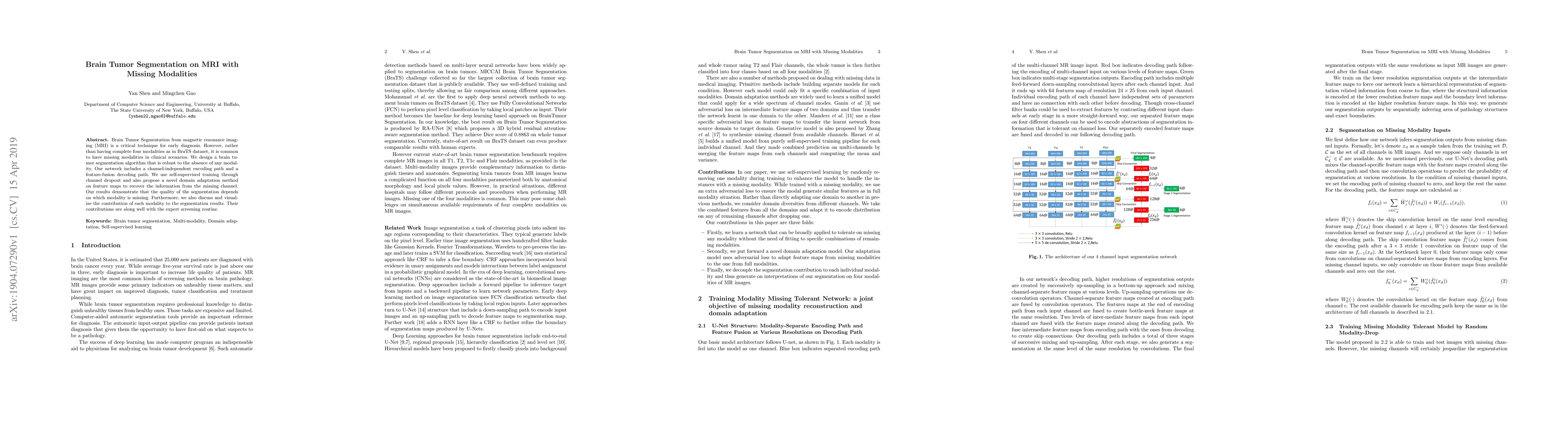 This paper presents a brain tumor segmentation algorithm robust to missing MRI modalities, utilizing a channel-independent encoding and feature-fusion decoding path. The network employs self-supervised training and a novel domain adaptation method to compensate for missing data, demonstrating modality-specific segmentation quality.