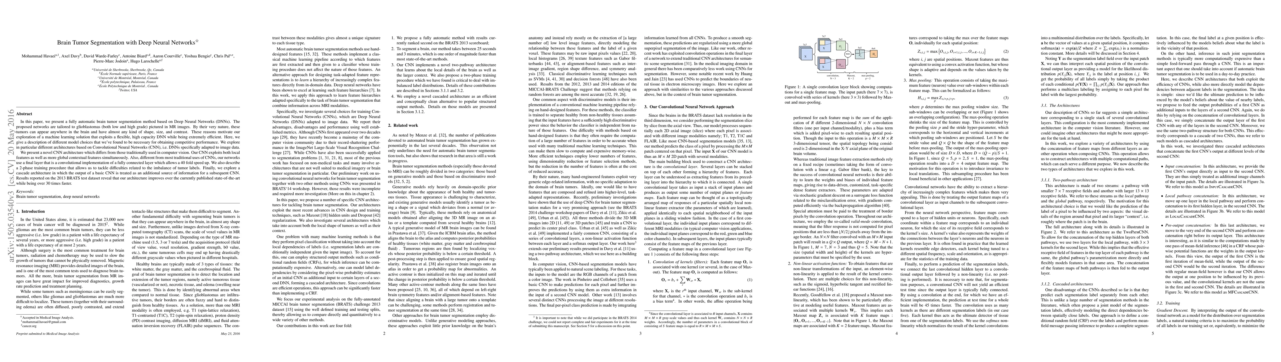 This paper presents a deep neural network method for automatically segmenting brain tumors from MRI images with improved performance over existing state-of-the-art methods.