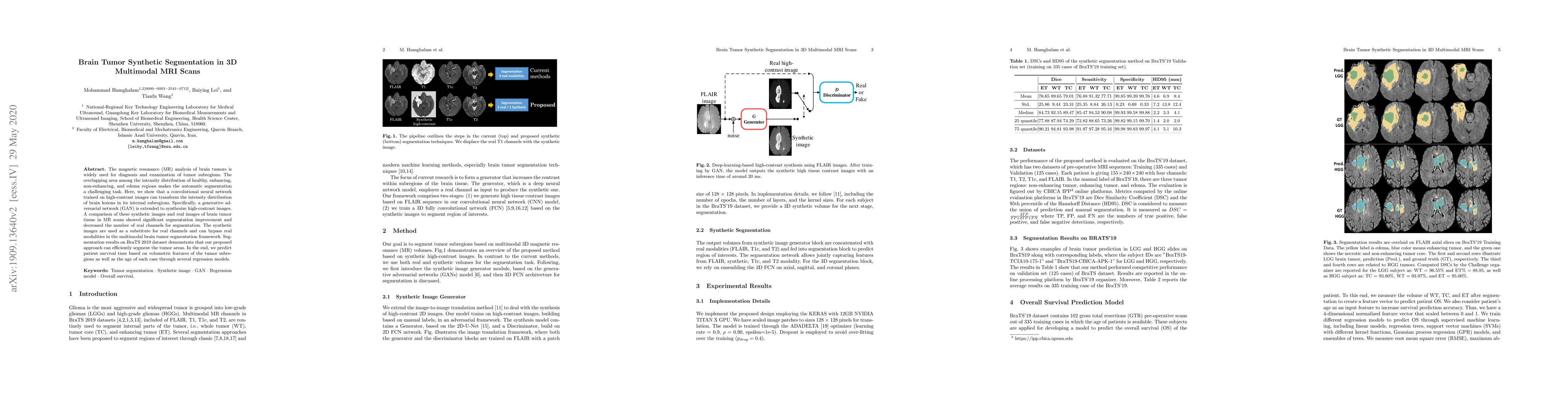 This paper proposes a synthetic segmentation method using a convolutional neural network and a generative adversarial network to enhance brain tumor segmentation in 3D multimodal MRI scans. The synthetic high-contrast images improve segmentation accuracy and reduce the reliance on real modalities, as demonstrated on the BraTS 2019 dataset.