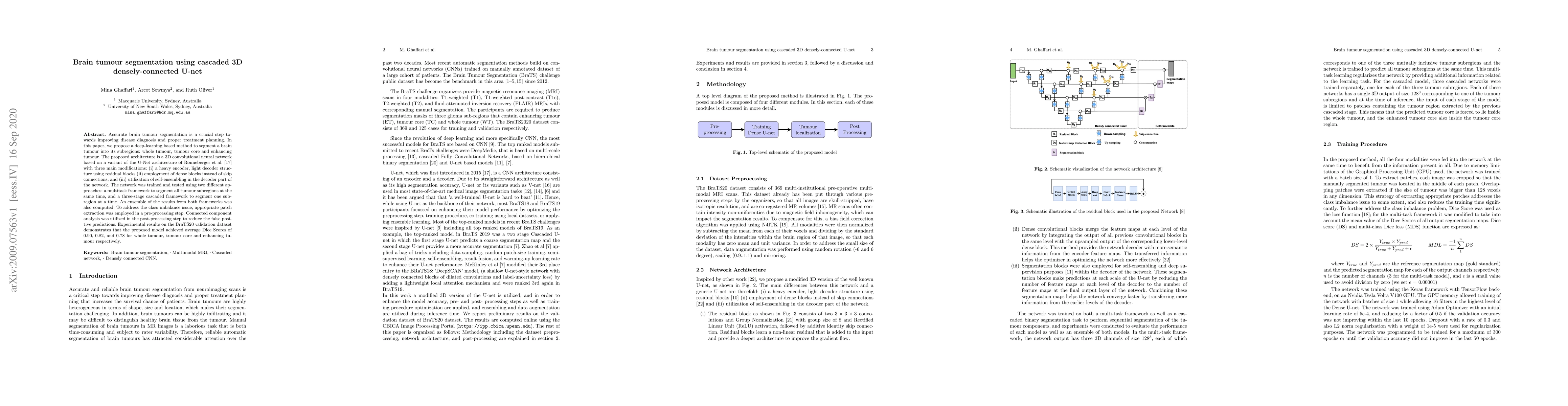 This paper proposes a deep-learning method using a cascaded 3D densely-connected U-Net to segment brain tumour subregions. The model achieved high Dice Scores of 0.90, 0.82, and 0.78 for whole tumour, tumour core, and enhancing tumour respectively, demonstrating its effectiveness in improving disease diagnosis and treatment planning.
