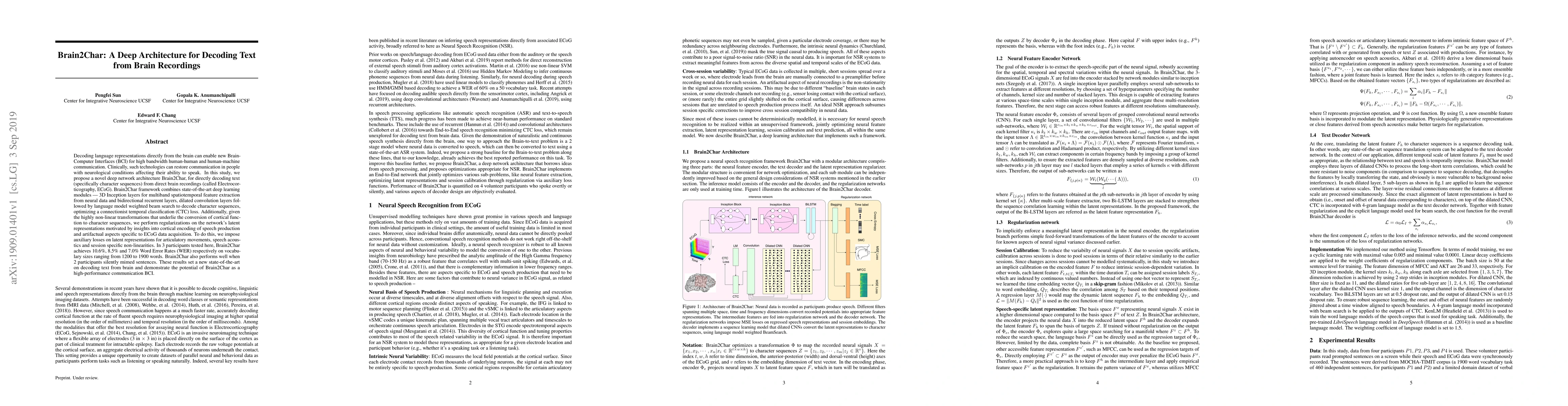 Brain2Char is a deep network architecture designed to decode text from brain recordings, achieving state-of-the-art results with 10.6%, 8.5%, and 7.0% Word Error Rates in three participants, demonstrating its potential for advanced Brain-Computer Interfaces.