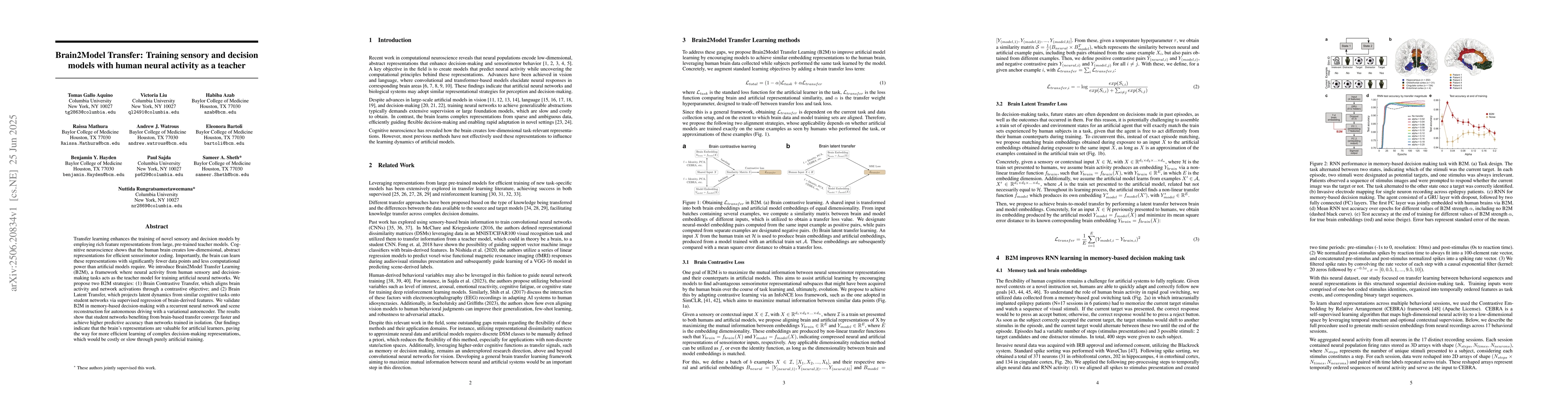 Transfer learning enhances the training of novel sensory and decision models by employing rich feature representations from large, pre-trained teacher models. Cognitive neuroscience shows that the human brain creates low-dimensional, abstract representations for efficient sensorimotor coding. Importantly, the brain can learn these representations with significantly fewer data points and less computational power than artificial models require. We introduce Brain2Model Transfer Learning (B2M), a framework where neural activity from human sensory and decision-making tasks acts as the teacher model for training artificial neural networks. We propose two B2M strategies: (1) Brain Contrastive Transfer, which aligns brain activity and network activations through a contrastive objective; and (2) Brain Latent Transfer, which projects latent dynamics from similar cognitive tasks onto student networks via supervised regression of brain-derived features. We validate B2M in memory-based decision-making with a recurrent neural network and scene reconstruction for autonomous driving with a variational autoencoder. The results show that student networks benefiting from brain-based transfer converge faster and achieve higher predictive accuracy than networks trained in isolation. Our findings indicate that the brain's representations are valuable for artificial learners, paving the way for more efficient learning of complex decision-making representations, which would be costly or slow through purely artificial training.
