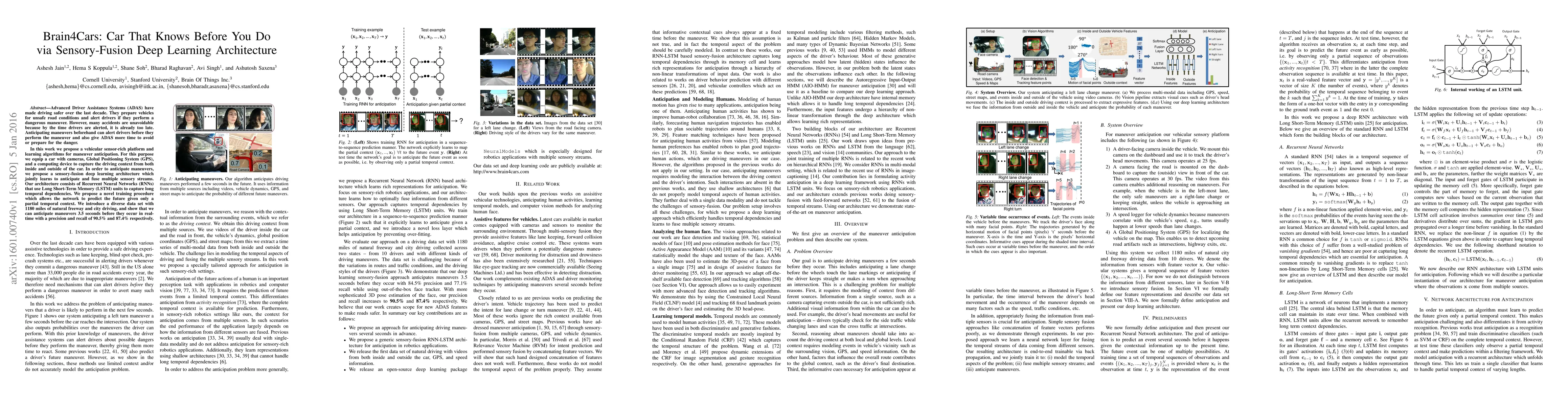 Advanced Driver Assistance Systems (ADAS) have made driving safer over the last decade. They prepare vehicles for unsafe road conditions and alert drivers if they perform a dangerous maneuver. However, many accidents are unavoidable because by the time drivers are alerted, it is already too late. Anticipating maneuvers beforehand can alert drivers before they perform the maneuver and also give ADAS more time to avoid or prepare for the danger. In this work we propose a vehicular sensor-rich platform and learning algorithms for maneuver anticipation. For this purpose we equip a car with cameras, Global Positioning System (GPS), and a computing device to capture the driving context from both inside and outside of the car. In order to anticipate maneuvers, we propose a sensory-fusion deep learning architecture which jointly learns to anticipate and fuse multiple sensory streams. Our architecture consists of Recurrent Neural Networks (RNNs) that use Long Short-Term Memory (LSTM) units to capture long temporal dependencies. We propose a novel training procedure which allows the network to predict the future given only a partial temporal context. We introduce a diverse data set with 1180 miles of natural freeway and city driving, and show that we can anticipate maneuvers 3.5 seconds before they occur in real-time with a precision and recall of 90.5\% and 87.4\% respectively.