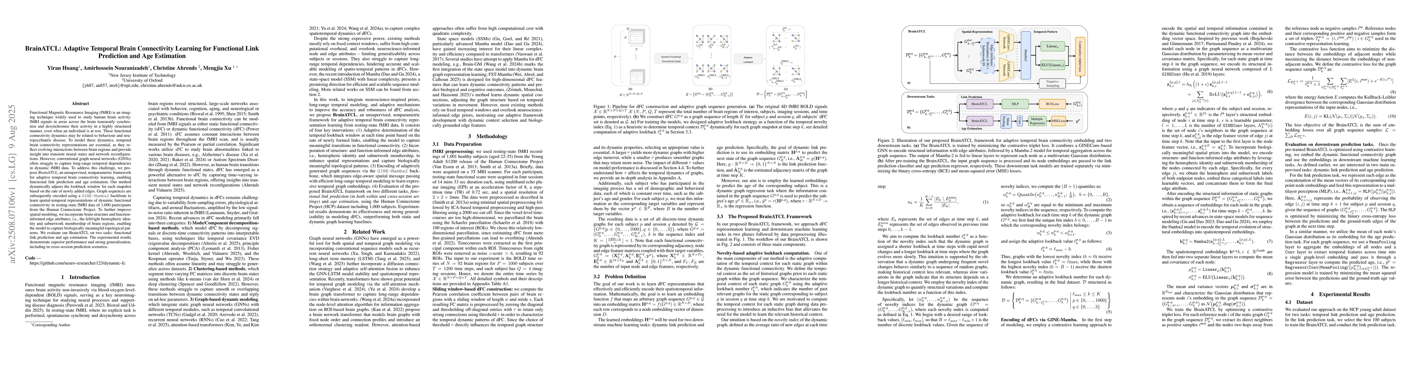 The main technical contribution is the development of BrainATCL, an adaptive temporal brain connectivity learning framework that improves functional link prediction and age estimation from resting-state fMRI data.