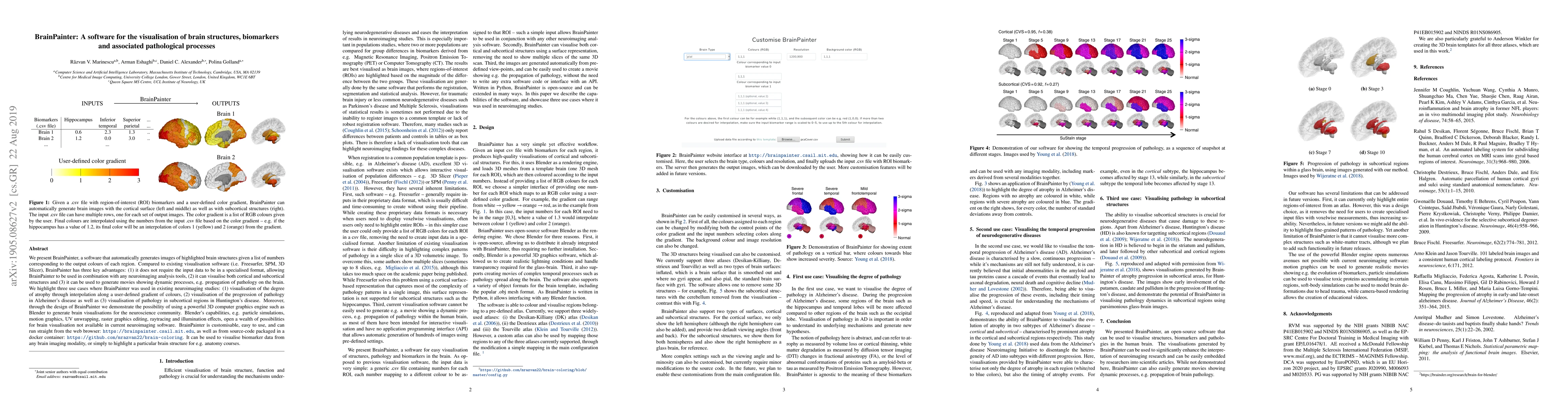 BrainPainter is a versatile software for visualizing brain structures and pathological processes, offering compatibility with any neuroimaging analysis tools and the ability to generate dynamic visualizations. It leverages Blender's powerful 3D graphics engine for advanced visualizations, and is accessible via web browser or Docker container.