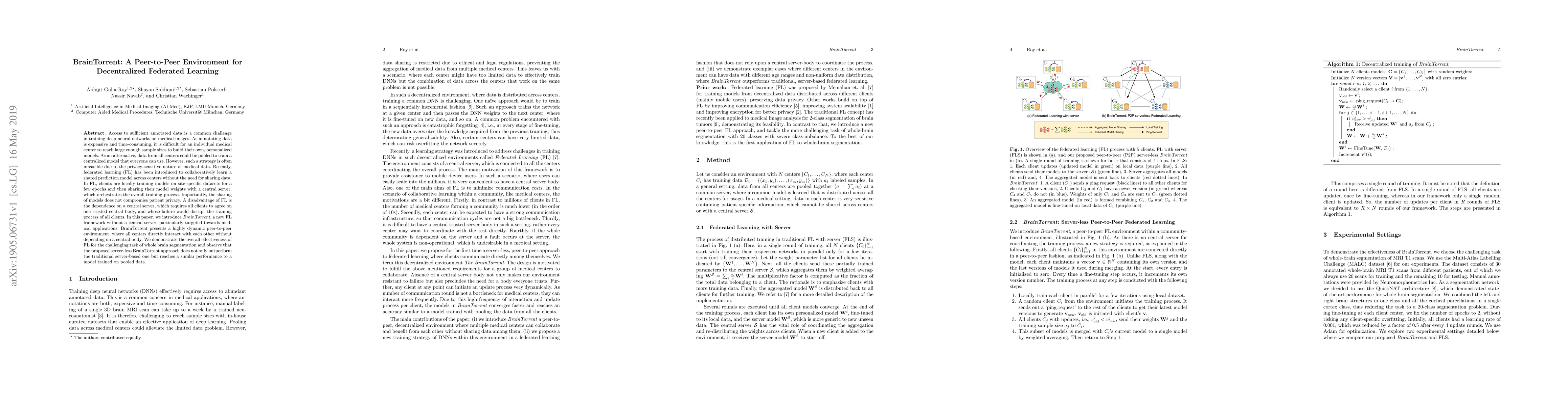 BrainTorrent is a peer-to-peer framework for decentralized federated learning that outperforms traditional server-based approaches in whole brain segmentation with similar performance to models trained on pooled data.