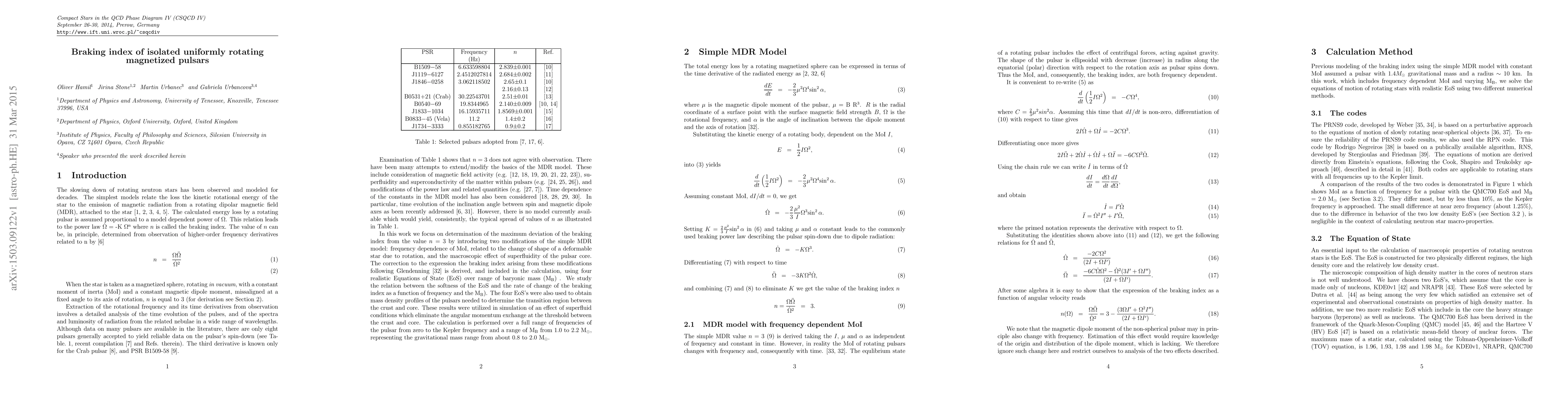 This paper investigates the braking index of isolated pulsars, which measures the rate of spin-down, and finds that observed values are consistently lower than those predicted by the magnetic dipole radiation model. The study uses realistic equations of state and computational models to explore the impact of rotation and superfluid matter, concluding that while rotation effects are significant at high frequencies, they have minimal impact on the braking index at currently observed frequencies.