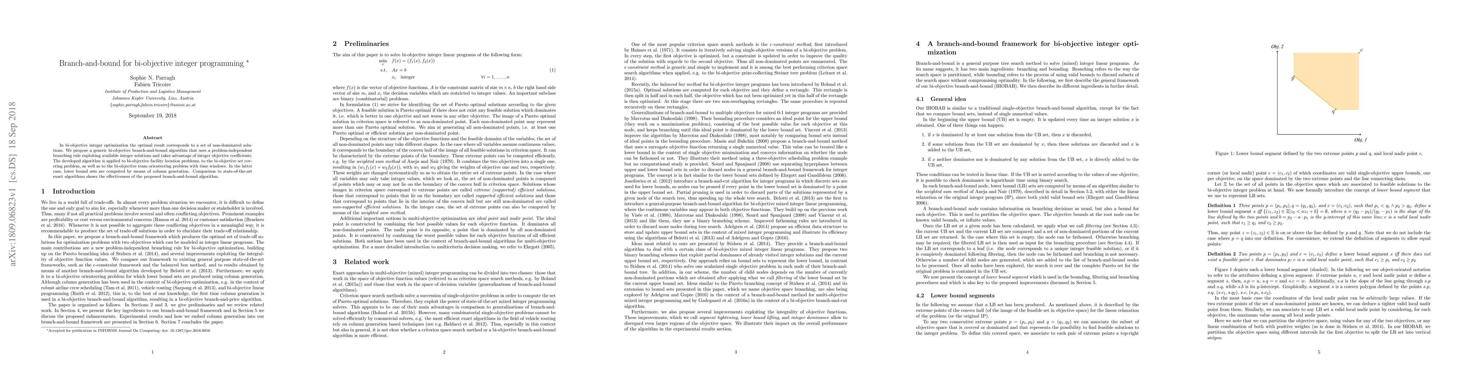 This paper proposes a generic bi-objective branch-and-bound algorithm for integer programming, which leverages integer solutions and coefficients. The algorithm is tested on bi-objective facility location, set covering, and team orienteering problems, demonstrating its effectiveness compared to state-of-the-art methods.