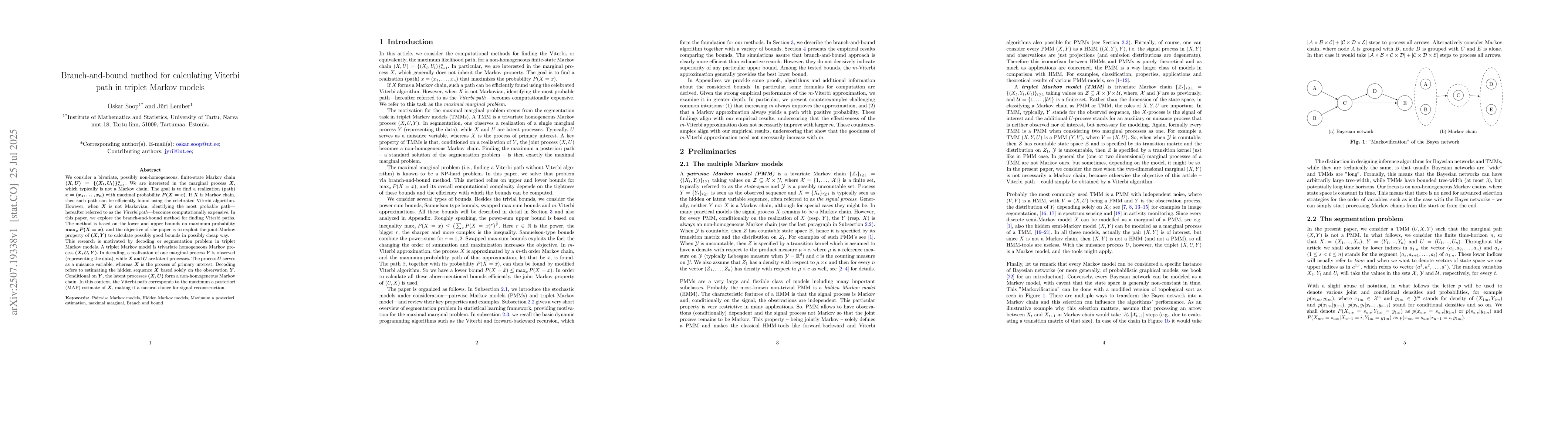 We consider a bivariate, possibly non-homogeneous, finite-state Markov chain $(X,U)=\{(X_t,U_t)\}_{t=1}^n$. We are interested in the marginal process $X$, which typically is not a Markov chain. The goal is to find a realization (path) $x=(x_1,\ldots,x_n)$ with maximal probability $P(X=x)$. If $X$ is Markov chain, then such path can be efficiently found using the celebrated Viterbi algorithm. However, when $X$ is not Markovian, identifying the most probable path -- hereafter referred to as the Viterbi path -- becomes computationally expensive. In this paper, we explore the branch-and-bound method for finding Viterbi paths. The method is based on the lower and upper bounds on maximum probability $\max_x P(X=x)$, and the objective of the paper is to exploit the joint Markov property of $(X,Y)$ to calculate possibly good bounds in possibly cheap way. This research is motivated by decoding or segmentation problem in triplet Markov models. A triplet Markov model is trivariate homogeneous Markov process $(X,U,Y)$. In decoding, a realization of one marginal process $Y$ is observed (representing the data), while $X$ and $U$ are latent processes. The process $U$ serves as a nuisance variable, whereas $X$ is the process of primary interest. Decoding refers to estimating the hidden sequence $X$ based solely on the observation $Y$. Conditional on $Y$, the latent processes $(X, U)$ form a non-homogeneous Markov chain. In this context, the Viterbi path corresponds to the maximum a posteriori (MAP) estimate of $X$, making it a natural choice for signal reconstruction.