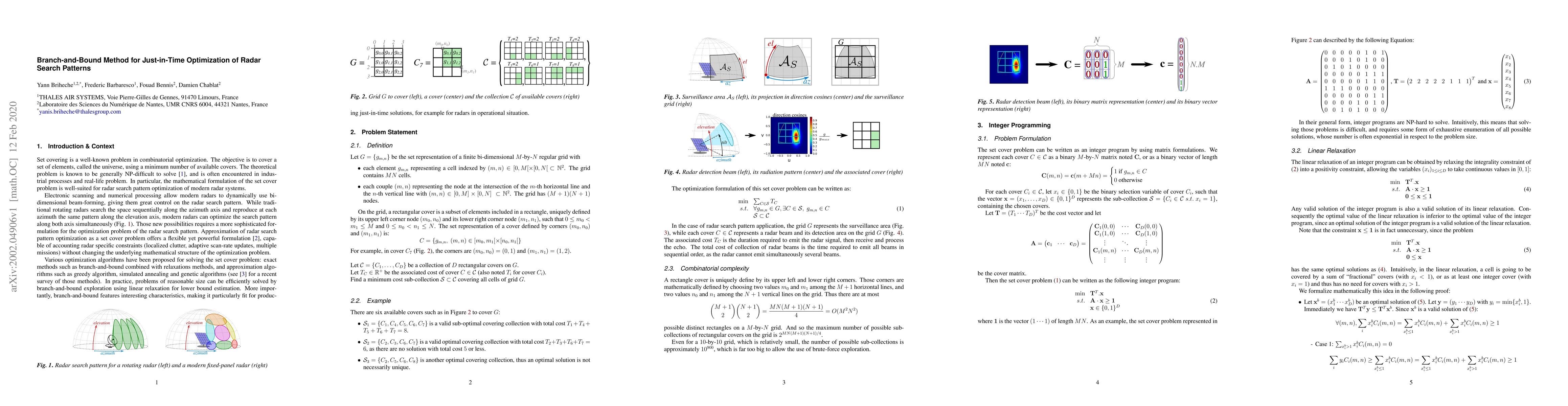 Electronic phased-array radars offer new possibilities for radar search pattern optimization by using bi-dimensional beam-forming and beam-steering. Radar search pattern optimization can be approximated as a set cover problem and solved using integer programming, while accounting for localized clutter and terrain masks in detection constraints. We present a set cover problem approximation for time-budget minimization of radar search patterns, under constraints of range, detection probability and direction-specific scan update rates. Branch\&Bound is a classical optimization procedure for solving combinatorial problems. It is known mainly as an exact algorithm, but features interesting characteristics, making it particularly fit for solving optimization problems in real-time applications and producing just-in-time solutions.
