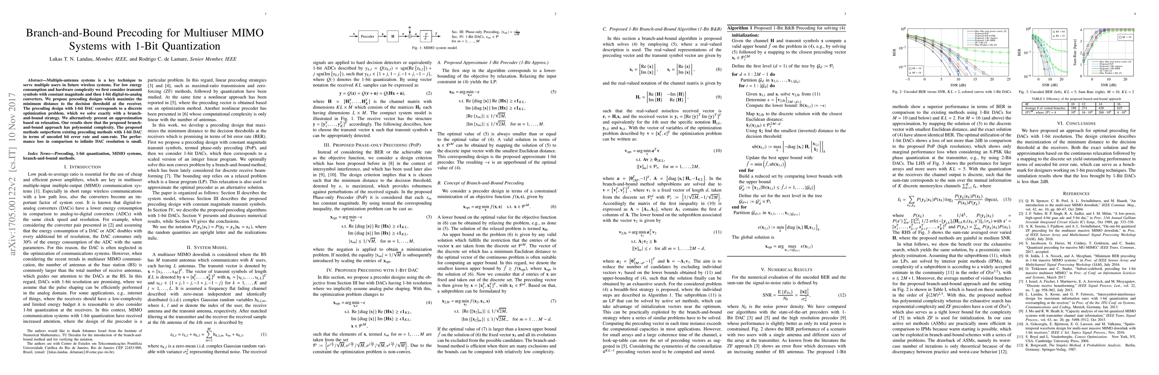 This paper proposes a branch-and-bound precoding method for multiuser MIMO systems with 1-bit quantization, achieving optimal performance with low energy and complexity. The approach maximizes minimum distance at the receiver, demonstrating superior uncoded bit error rate and sum-rate compared to existing methods.