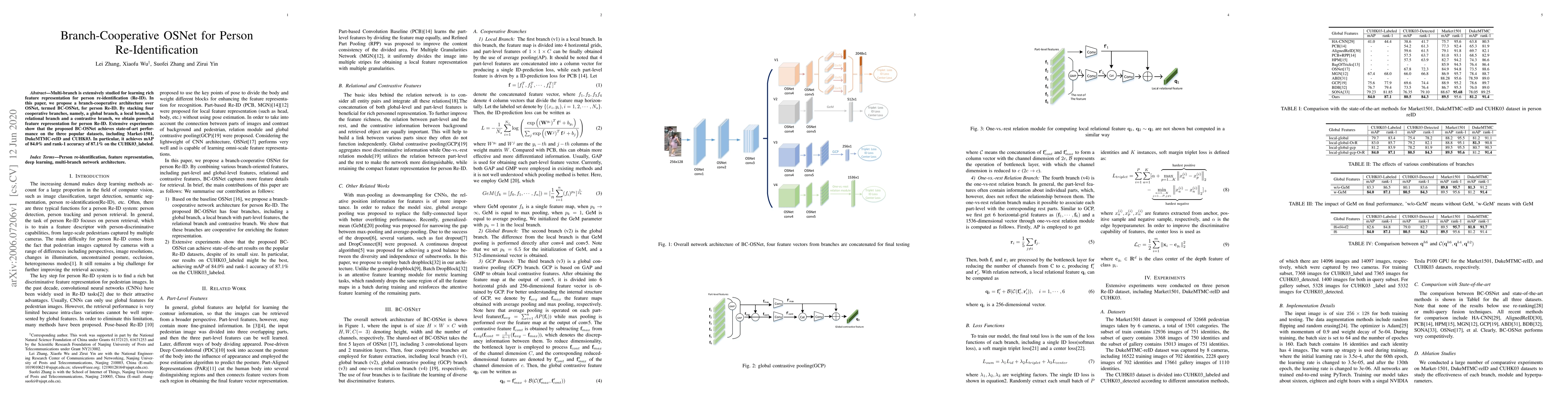 The paper proposes BC-OSNet, a branch-cooperative architecture built on OSNet, utilizing four cooperative branches to enhance feature representation for person re-identification. The method achieves state-of-the-art performance on three popular datasets, with an mAP of 84.0% and rank-1 accuracy of 87.1% on CUHK03_labeled.