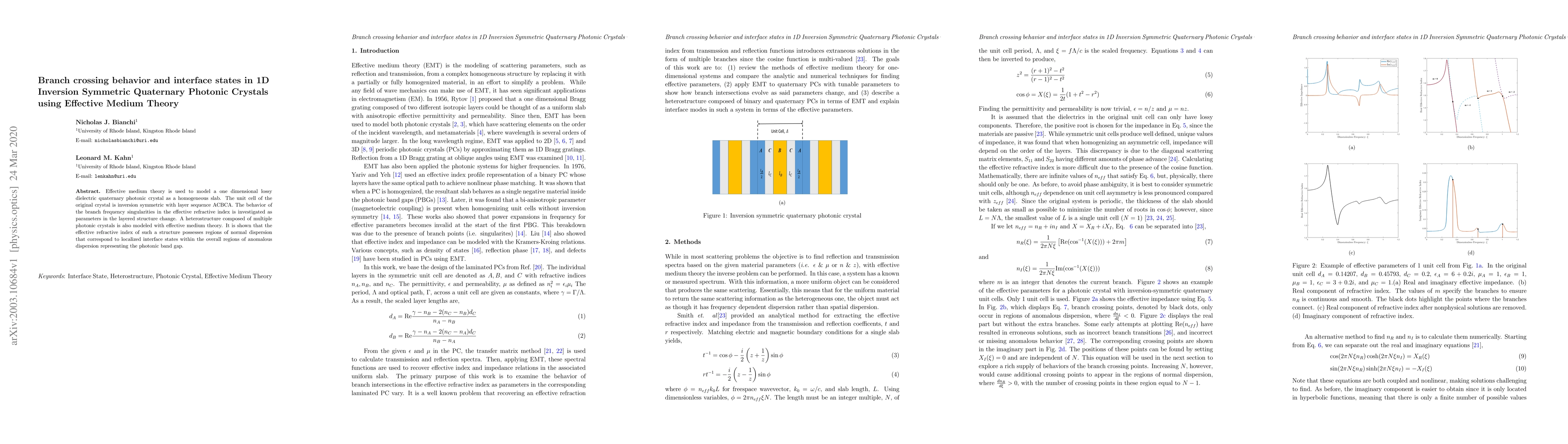 Effective medium theory is used to model a one dimensional lossy dielectric quaternary photonic crystal as a homogeneous slab. The unit cell of the original crystal is inversion symmetric with layer sequence ACBCA. The behavior of the branch frequency singularities in the effective refractive index is investigated as parameters in the layered structure change. A heterostructure composed of multiple photonic crystals is also modeled with effective medium theory. It is shown that the effective refractive index of such a structure possesses regions of normal dispersion that correspond to localized interface states within the overall regions of anomalous dispersion representing the photonic band gap.