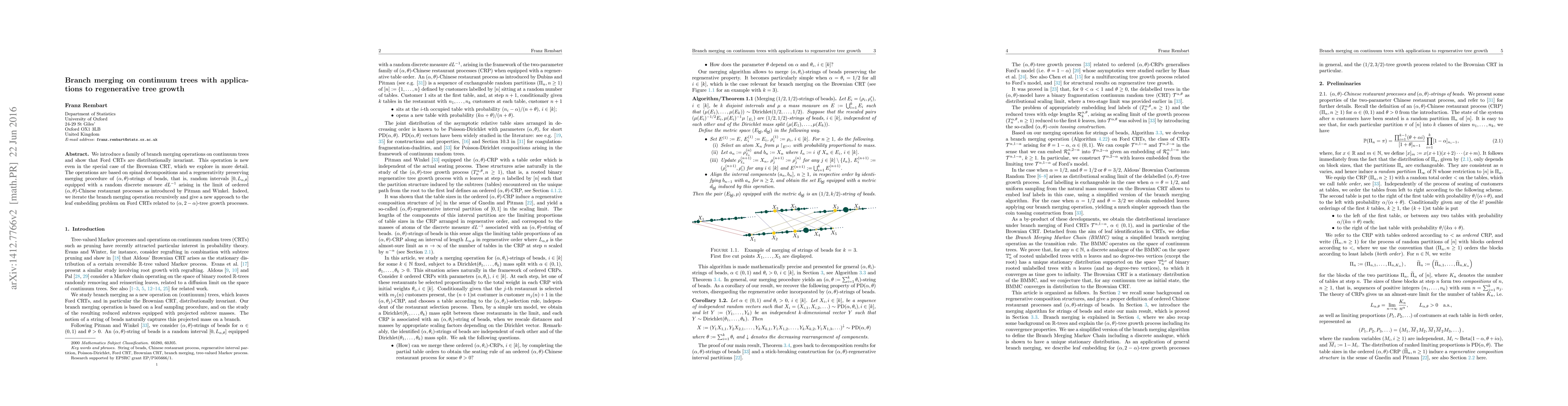 This paper introduces novel branch merging operations on continuum trees, demonstrating distributional invariance in Ford CRTs, and applies these to regenerative tree growth processes. It explores the merging of $(\alpha, \theta)$-strings of beads, providing a recursive approach to the leaf embedding problem on Ford CRTs.