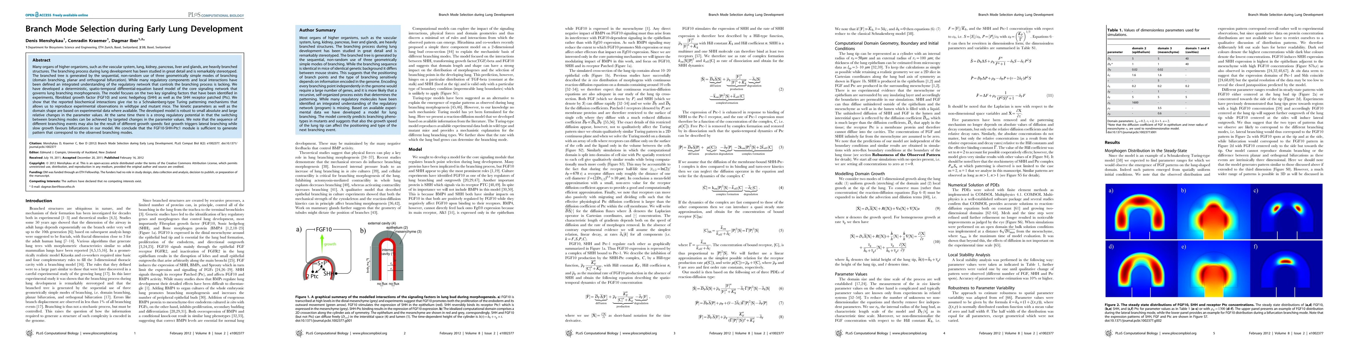 Many organs of higher organisms, such as the vascular system, lung, kidney, pancreas, liver and glands, are heavily branched structures. The branching process during lung development has been studied in great detail and is remarkably stereotyped. The branched tree is generated by the sequential, non-random use of three geometrically simple modes of branching (domain branching, planar and orthogonal bifurcation). While many regulatory components and local interactions have been defined an integrated understanding of the regulatory network that controls the branching process is lacking. We have developed a deterministic, spatio-temporal differential-equation based model of the core signaling network that governs lung branching morphogenesis. The model focuses on the two key signaling factors that have been identified in experiments, fibroblast growth factor (FGF10) and sonic hedgehog (SHH) as well as the SHH receptor patched (Ptc). We show that the reported biochemical interactions give rise to a Schnakenberg-type Turing patterning mechanisms that allows us to reproduce experimental observations in wildtype and mutant mice. The kinetic parameters as well as the domain shape are based on experimental data where available. The developed model is robust to small absolute and large relative changes in the parameter values. At the same time there is a strong regulatory potential in that the switching between branching modes can be achieved by targeted changes in the parameter values. We note that the sequence of different branching events may also be the result of different growth speeds: fast growth triggers lateral branching while slow growth favours bifurcations in our model. We conclude that the FGF10-SHH-Ptc1 module is sufficient to generate pattern that correspond to the observed branching modes