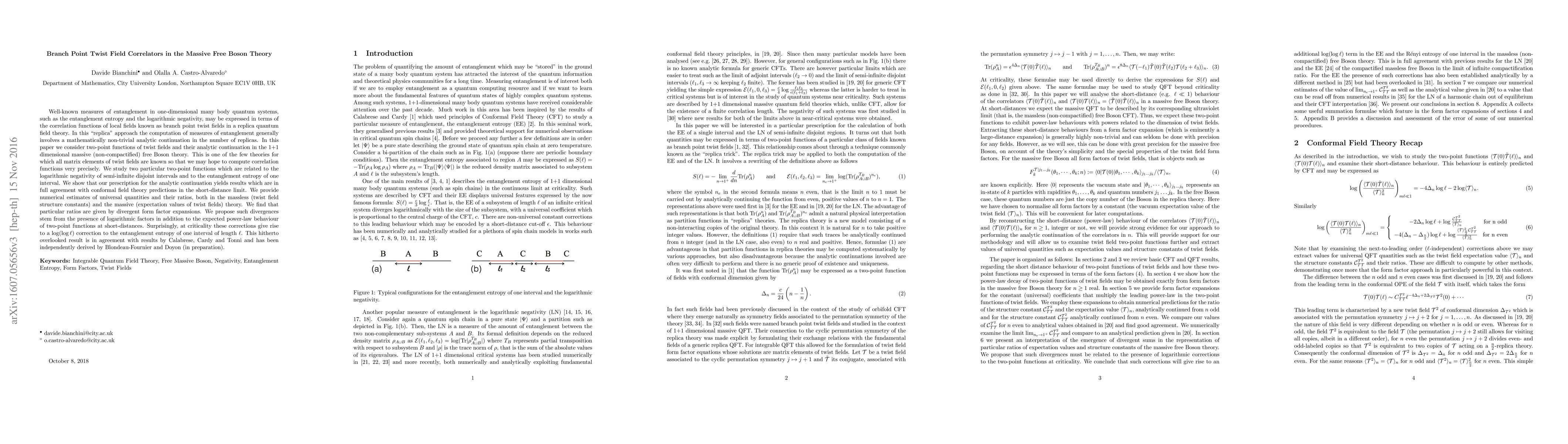 Well-known measures of entanglement in one-dimensional many body quantum systems, such as the entanglement entropy and the logarithmic negativity, may be expressed in terms of the correlation functions of local fields known as branch point twist fields in a replica quantum field theory. In this "replica" approach the computation of measures of entanglement generally involves a mathematically non-trivial analytic continuation in the number of replicas. In this paper we consider two-point functions of twist fields and their analytic continuation in the 1+1 dimensional massive (non-compactified) free Boson theory. This is one of the few theories for which all matrix elements of twist fields are known so that we may hope to compute correlation functions very precisely. We study two particular two-point functions which are related to the logarithmic negativity of semi-infinite disjoint intervals and to the entanglement entropy of one interval. We show that our prescription for the analytic continuation yields results which are in full agreement with conformal field theory predictions in the short-distance limit. We provide numerical estimates of universal quantities and their ratios, both in the massless (twist field structure constants) and the massive (expectation values of twist fields) theory. We find that particular ratios are given by divergent form factor expansions. We propose such divergences stem from the presence of logarithmic factors in addition to the expected power-law behaviour of two-point functions at short-distances. Surprisingly, at criticality these corrections give rise to a log(logL) correction to the entanglement entropy of one interval of length L. This hitherto overlooked result is in agreement with results by Calabrese, Cardy and Tonni and has been independently derived by Blondeau-Fournier and Doyon (in preparation).