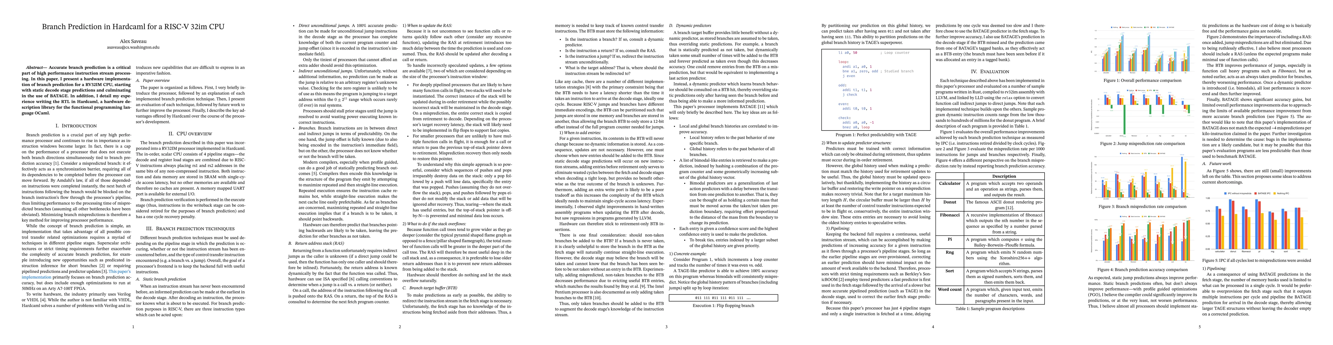 This paper presents a hardware implementation of branch prediction for a RISC-V 32im CPU, utilizing static decode stage predictions and advanced BATAGE techniques to enhance performance. The author also shares insights on writing the RTL in Hardcaml, a hardware description library for OCaml.