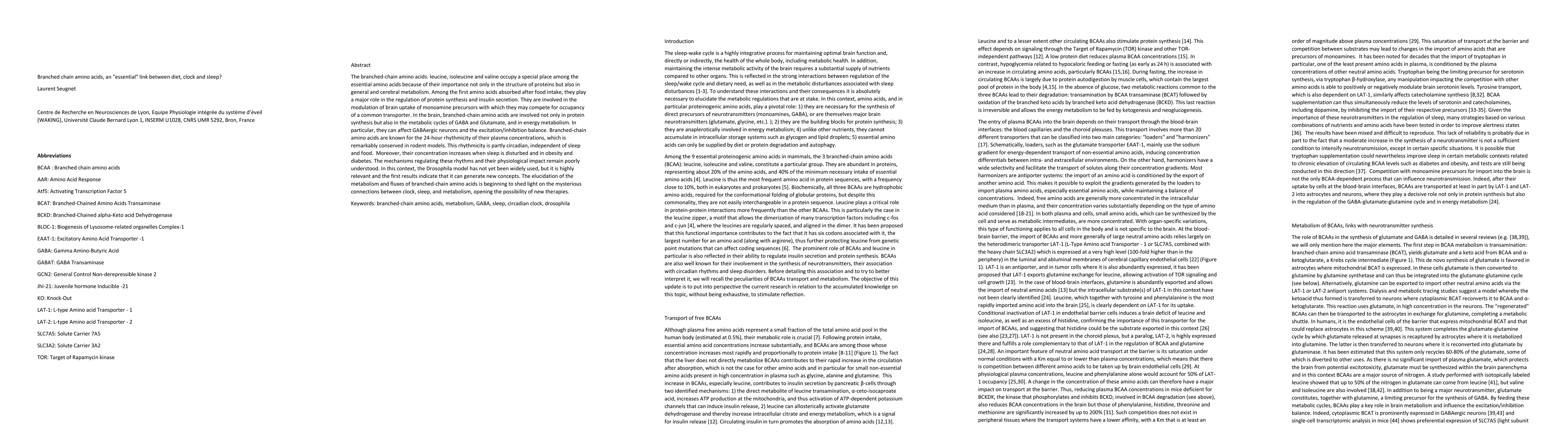 The branched-chain amino acids: leucine, isoleucine and valine occupy a special place among the essential amino acids because of their importance not only in the structure of proteins but also in general and cerebral metabolism. Among the first amino acids absorbed after food intake, they play a major role in the regulation of protein synthesis and insulin secretion. They are involved in the modulation of brain uptake of monoamine precursors with which they may compete for occupancy of a common transporter. In the brain, branched-chain amino acids are involved not only in protein synthesis but also in the metabolic cycles of GABA and Glutamate, and in energy metabolism. In particular, they can affect GABAergic neurons and the excitation/inhibition balance. Branched-chain amino acids are known for the 24-hour rhythmicity of their plasma concentrations, which is remarkably conserved in rodent models. This rhythmicity is partly circadian, independent of sleep and food. Moreover, their concentration increases when sleep is disturbed and in obesity and diabetes. The mechanisms regulating these rhythms and their physiological impact remain poorly understood. In this context, the Drosophila model has not yet been widely used, but it is highly relevant and the first results indicate that it can generate new concepts. The elucidation of the metabolism and fluxes of branched-chain amino acids is beginning to shed light on the mysterious connections between clock, sleep, and metabolism, opening the possibility of new therapies.