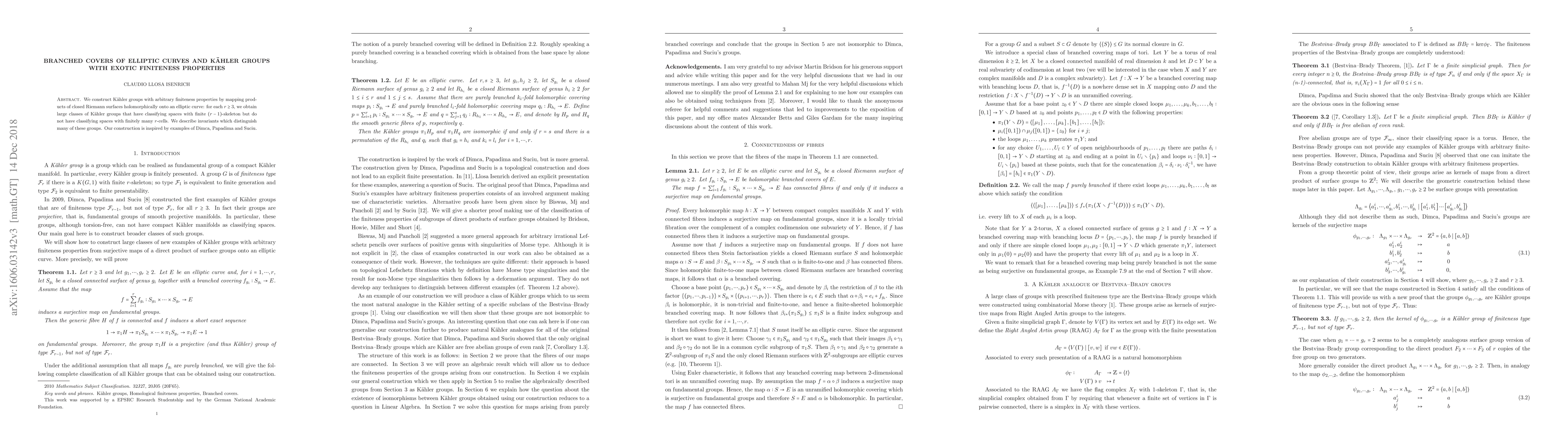 Summary: This paper constructs Kähler groups via branched covers of elliptic curves, demonstrating that these groups can exhibit exotic finiteness properties, specifically having finite $(r-1)$-skeleton but lacking finite $r$-cells in their classifying spaces for $r\geq 3$. The construction is inspired by previous work in the area.