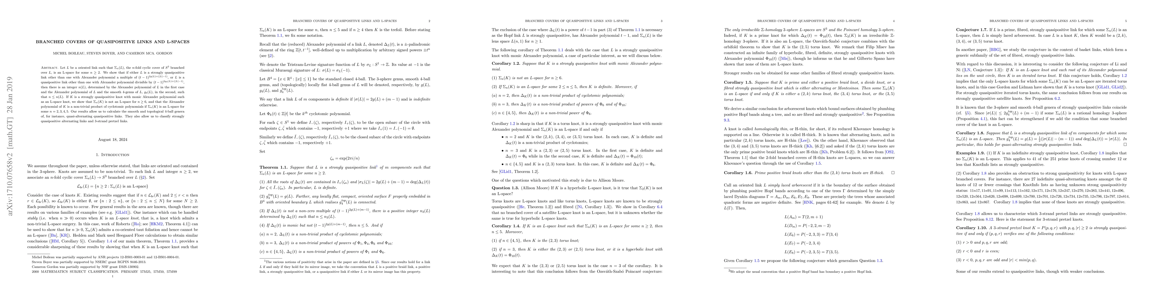 Let $L$ be a oriented link such that $\Sigma_n(L)$, the $n$-fold cyclic cover of $S^3$ branched over $L$, is an L-space for some $n \geq 2$. We show that if either $L$ is a strongly quasipositive link other than one with Alexander polynomial a multiple of $(t-1)^{2g(L) + (|L|-1)}$, or $L$ is a quasipositive link other than one with Alexander polynomial divisible by $(t-1)^{2g_4(L) + (|L|-1)}$, then there is an integer $n(L)$, determined by the Alexander polynomial of $L$ in the first case and the Alexander polynomial of $L$ and the smooth $4$-genus of $L$, $g_4(L)$, in the second, such that $n \leq n(L)$. If $K$ is a strongly quasipositive knot with monic Alexander polynomial such as an L-space knot, we show that $\Sigma_n(K)$ is not an L-space for $n \geq 6$, and that the Alexander polynomial of $K$ is a non-trivial product of cyclotomic polynomials if $\Sigma_n(K)$ is an L-space for some $n = 2, 3, 4, 5$. Our results allow us to calculate the smooth and topological 4-ball genera of, for instance, quasi-alternating quasipositive links. They also allow us to classify strongly quasipositive alternating links and $3$-strand pretzel links.