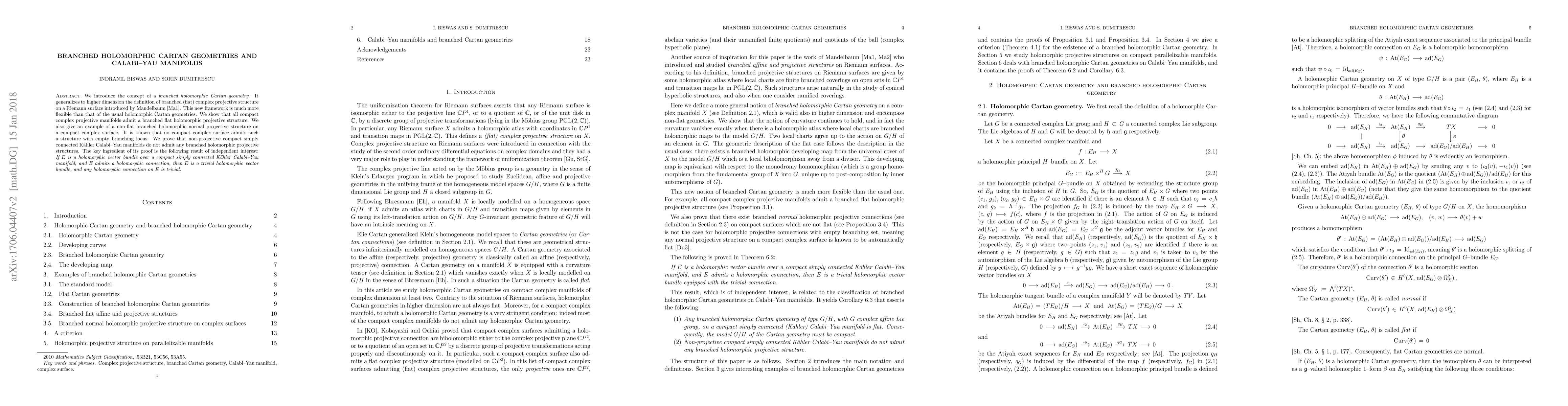 This paper introduces branched holomorphic Cartan geometries, generalizing complex projective structures to higher dimensions. It demonstrates that compact complex projective manifolds can have branched flat holomorphic projective structures and provides a proof that non-projective Calabi-Yau manifolds cannot admit such structures, relying on the result that holomorphic vector bundles over such manifolds with connections must be trivial.