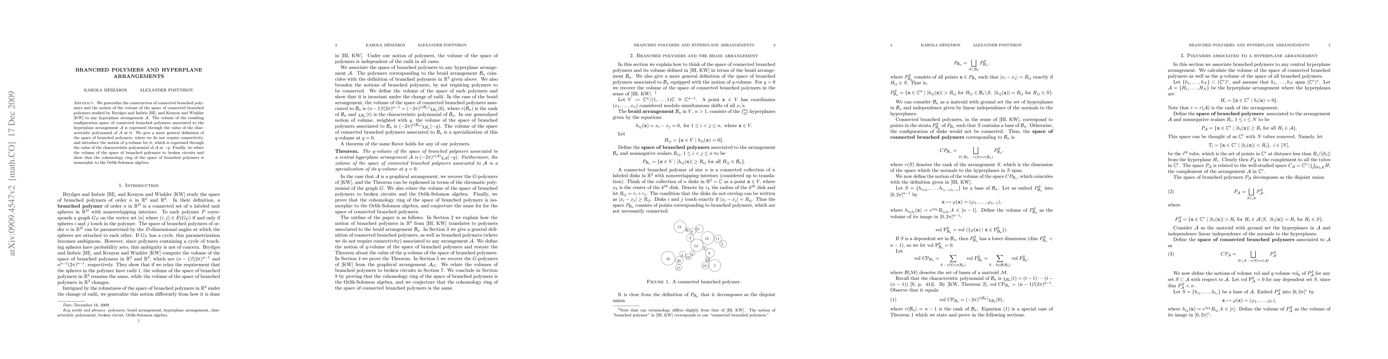 This paper generalizes the study of connected branched polymers to any hyperplane arrangement, expressing their volume via the characteristic polynomial of the arrangement. It also introduces a q-volume concept and relates the volume to broken circuits, showing the cohomology ring is isomorphic to the Orlik-Solomon algebra.