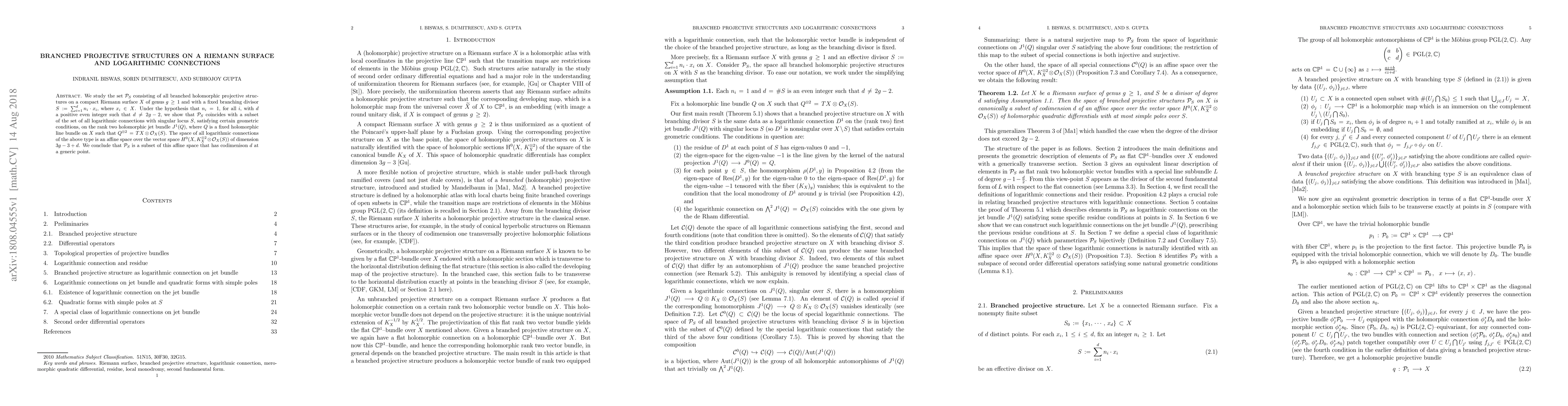 We study the set ${\mathcal P}_S$ consisting of all branched holomorphic projective structures on a compact Riemann surface $X$ of genus $g \geq 1$ and with a fixed branching divisor $S:= \sum_{i=1}^d n_i\cdot x_i$, where $x_i \in X$. Under the hypothesis that $n_i=1$, for all $i$, with $d$ a positive even integer such that $d \neq 2g-2$, we show that ${\mathcal P}_S$ coincides with a subset of the set of all logarithmic connections with singular locus $S$, satisfying certain geometric conditions, on the rank two holomorphic jet bundle $J^1(Q)$, where $Q$ is a fixed holomorphic line bundle on $X$ such that $Q^{\otimes 2}= TX\otimes {\mathcal O}_X(S)$. The space of all logarithmic connections of the above type is an affine space over the vector space $H^0(X, K^{\otimes 2}_X \otimes {\mathcal O}_X(S))$ of dimension $3g-3+d$. We conclude that ${\mathcal P}_S$ is a subset of this affine space that has codimenison $d$ at a generic point.