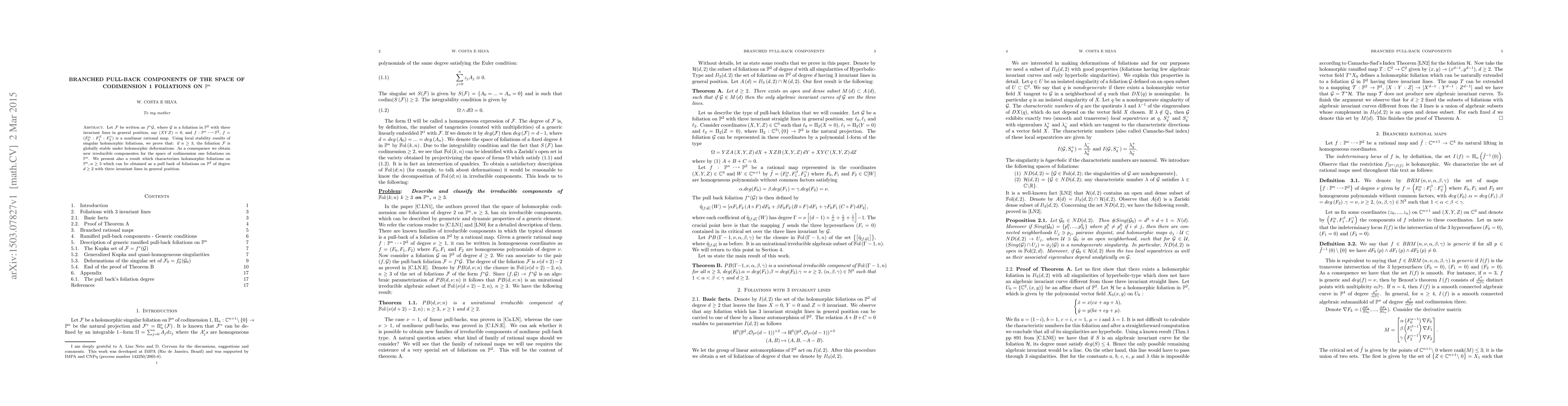 Let $\mathcal{F}$ be written as $ f^{*}\mathcal{G}$, where $\mathcal{G}$ is a foliation in $ {\mathbb P^2}$ with three invariant lines in general position, say $(XYZ)=0$, and $f:{\mathbb P^n}--->{\mathbb P^2}$, $f=(F^\alpha_{0}:F^\beta_{1}:F^\gamma_{2})$ is a nonlinear rational map. Using local stability results of singular holomorphic foliations, we prove that: if $n\geq 3$, the foliation $\mathcal{F}$ is globally stable under holomorphic deformations. As a consequence we obtain new irreducible componentes for the space of codimension one foliations on $\mathbb P^n$. We present also a result which characterizes holomorphic foliations on ${\mathbb P^n}, n\geq 3$ which can be obtained as a pull back of foliations on $ {\mathbb P^2}$ of degree $d\geq2$ with three invariant lines in general position.