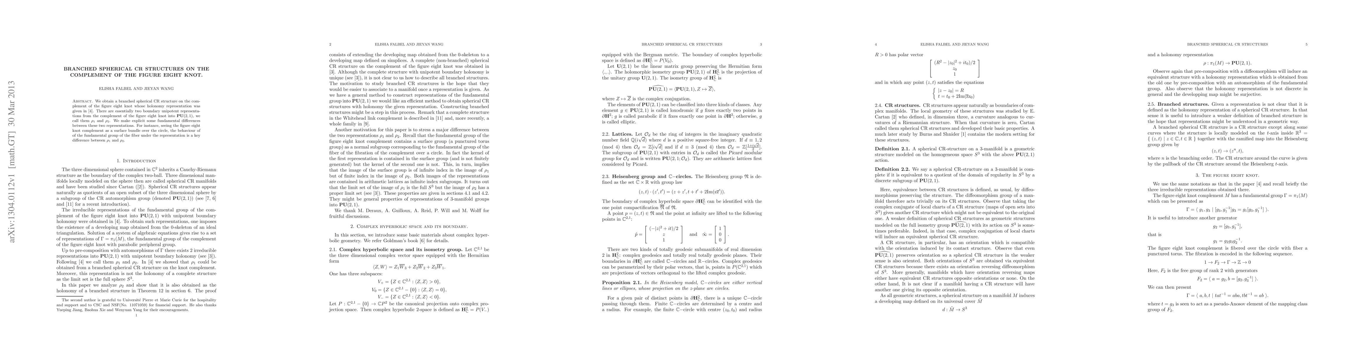 The paper constructs a branched spherical CR structure on the complement of the figure eight knot using two boundary unipotent representations, rho_1 and rho_2, focusing on explicit differences between them, particularly in the behavior of the fundamental group of the fiber under these representations when the complement is viewed as a surface bundle over the circle.