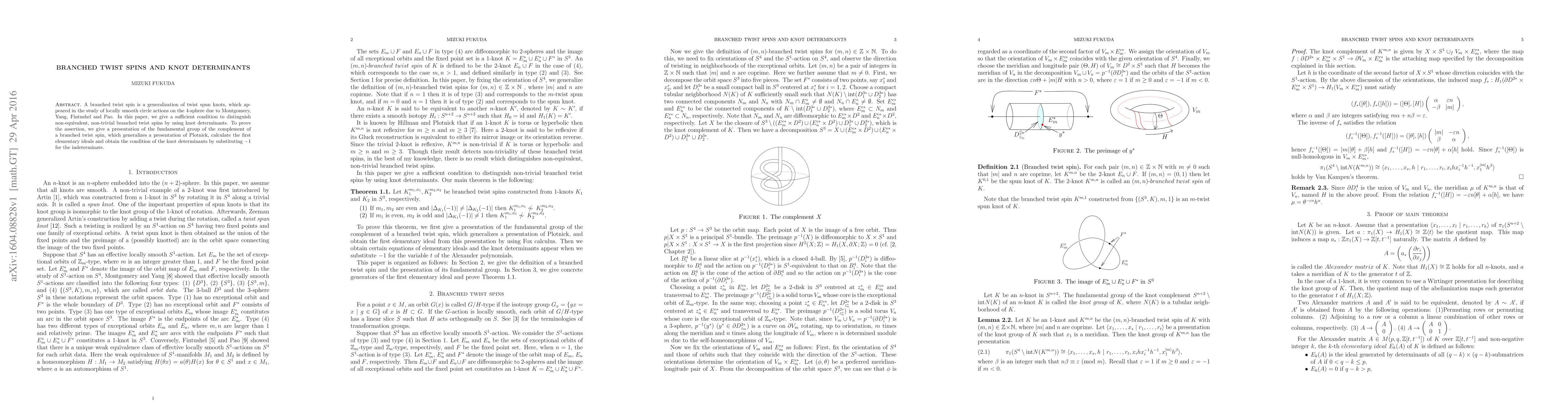 The paper presents a sufficient condition to distinguish non-equivalent, non-trivial branched twist spins using knot determinants. It involves presenting the fundamental group of the complement of a branched twist spin and calculating its first elementary ideals.