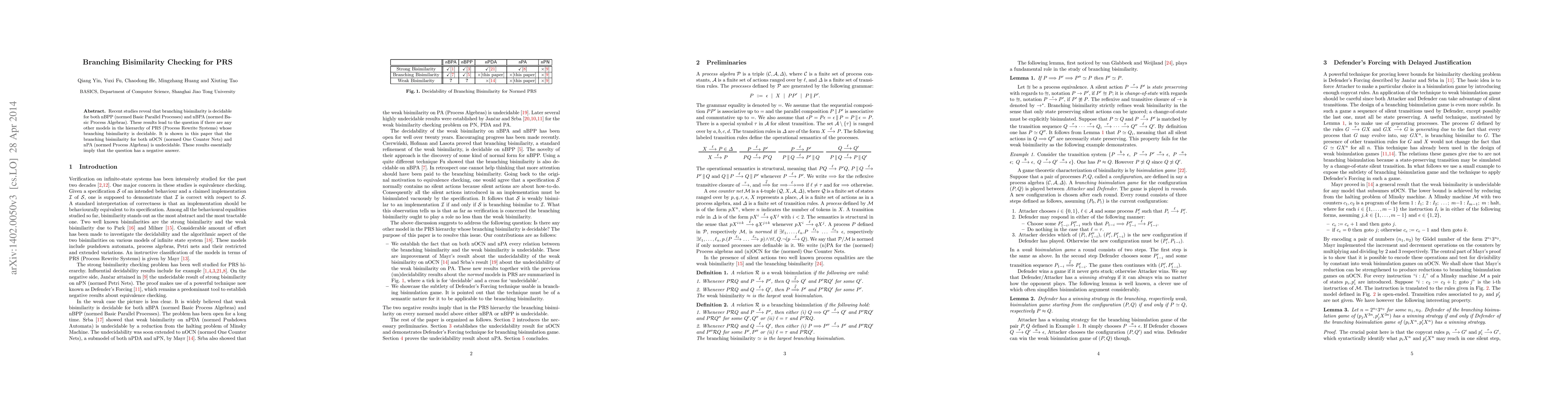 Recent studies reveal that branching bisimilarity is decidable for both nBPP (normed Basic Parallel Process) and nBPA (normed Basic Process Algebra). These results lead to the question if there are any other models in the hierarchy of PRS (Process Rewrite System) whose branching bisimilarity is decidable. It is shown in this paper that the branching bisimilarity for both nOCN (normed One Counter Net) and nPA (normed Process Algebra) is undecidable. These results essentially imply that the question has a negative answer.