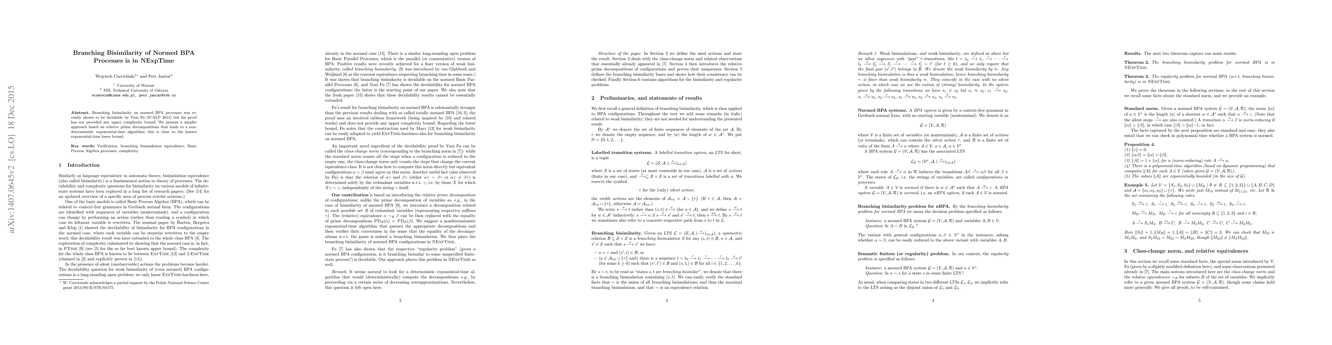 Title: Branching Bisimilarity of Normed BPA Processes is in NEXPTIME Summary: This paper presents a simpler algorithm for determining branching bisimilarity of normed BPA processes, showing it can be solved in nondeterministic exponential time (NEXPTIME), aligning closely with known lower complexity bounds.