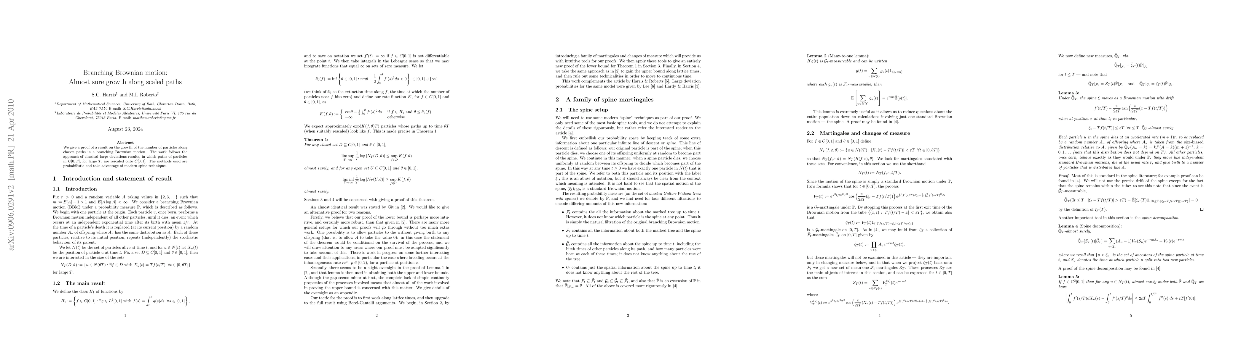 We give a proof of a result on the growth of the number of particles along chosen paths in a branching Brownian motion. The work follows the approach of classical large deviations results, in which paths in $C[0,1]$ are rescaled onto $C[0,T]$ for large $T$. The methods used are probabilistic and take advantage of modern spine techniques.