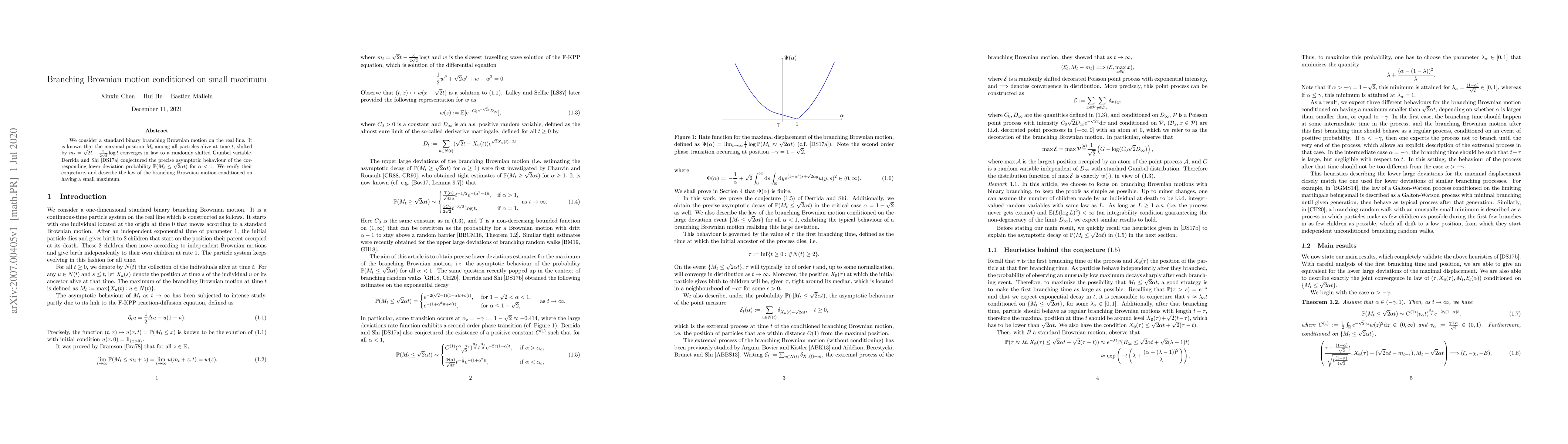 This paper verifies the conjecture by Derrida and Shi regarding the precise asymptotic behavior of the lower deviation probability for a standard binary branching Brownian motion, and describes the law of the motion conditioned on having a small maximum. The study focuses on the maximal position among particles and its convergence to a randomly shifted Gumbel variable.