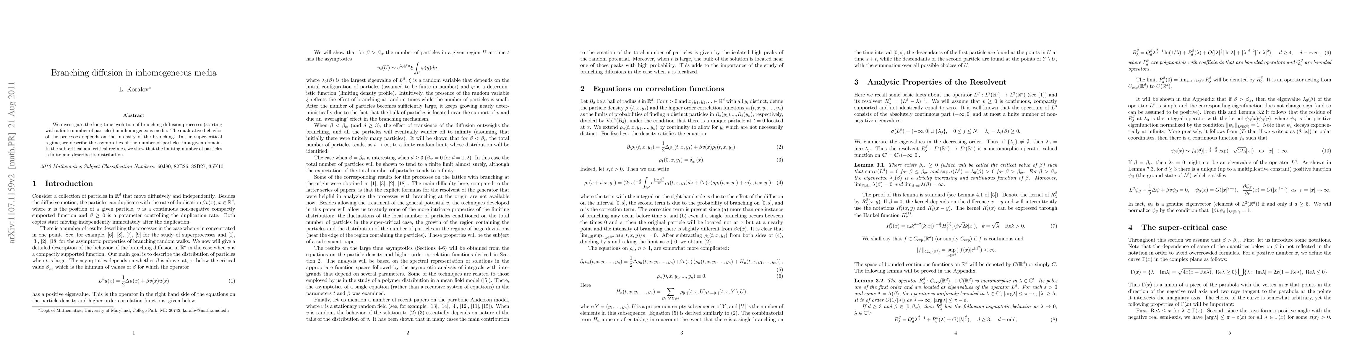 The paper investigates the long-term evolution of branching diffusion processes in inhomogeneous media, showing that the number of particles can be finite or infinite depending on the branching intensity. The study describes the asymptotics of particle numbers in different regimes.