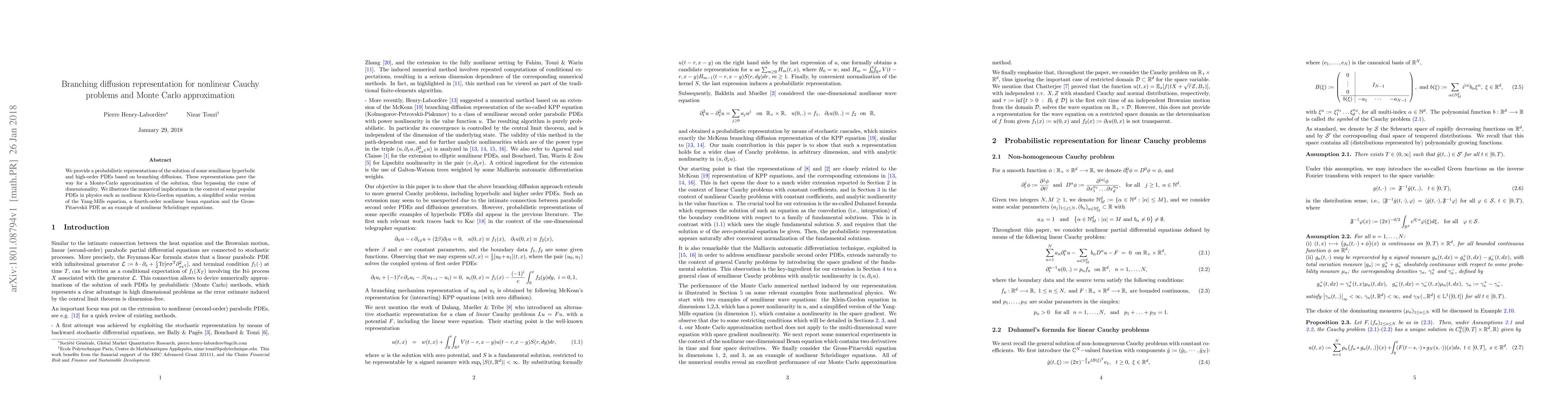 This paper introduces probabilistic representations of solutions to semilinear hyperbolic and high-order PDEs using branching diffusions, enabling Monte Carlo approximations that circumvent the curse of dimensionality. It demonstrates the method's effectiveness through applications to various physical PDEs, including the nonlinear Klein-Gordon and Gross-Pitaevskii equations.