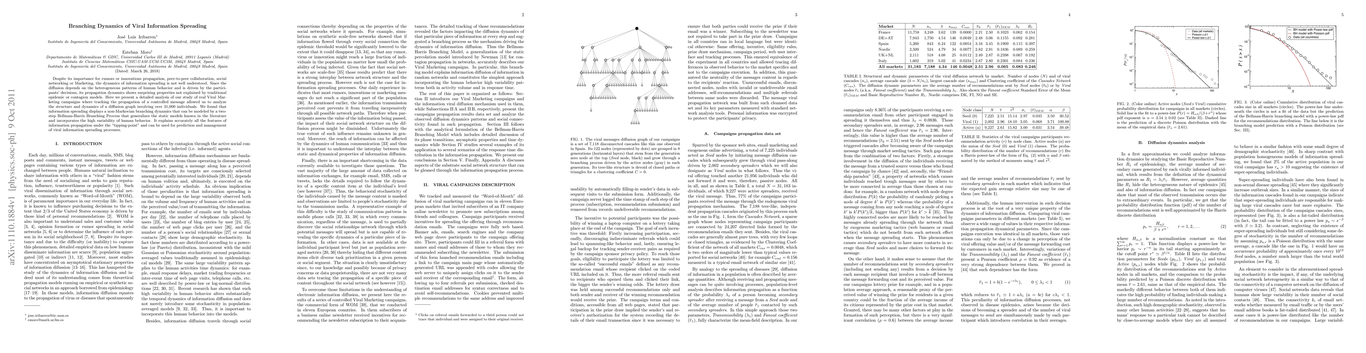 Despite its importance for rumors or innovations propagation, peer-to-peer collaboration, social networking or Marketing, the dynamics of information spreading is not well understood. Since the diffusion depends on the heterogeneous patterns of human behavior and is driven by the participants' decisions, its propagation dynamics shows surprising properties not explained by traditional epidemic or contagion models. Here we present a detailed analysis of our study of real Viral Marketing campaigns where tracking the propagation of a controlled message allowed us to analyze the structure and dynamics of a diffusion graph involving over 31,000 individuals. We found that information spreading displays a non-Markovian branching dynamics that can be modeled by a two-step Bellman-Harris Branching Process that generalizes the static models known in the literature and incorporates the high variability of human behavior. It explains accurately all the features of information propagation under the "tipping-point" and can be used for prediction and management of viral information spreading processes.