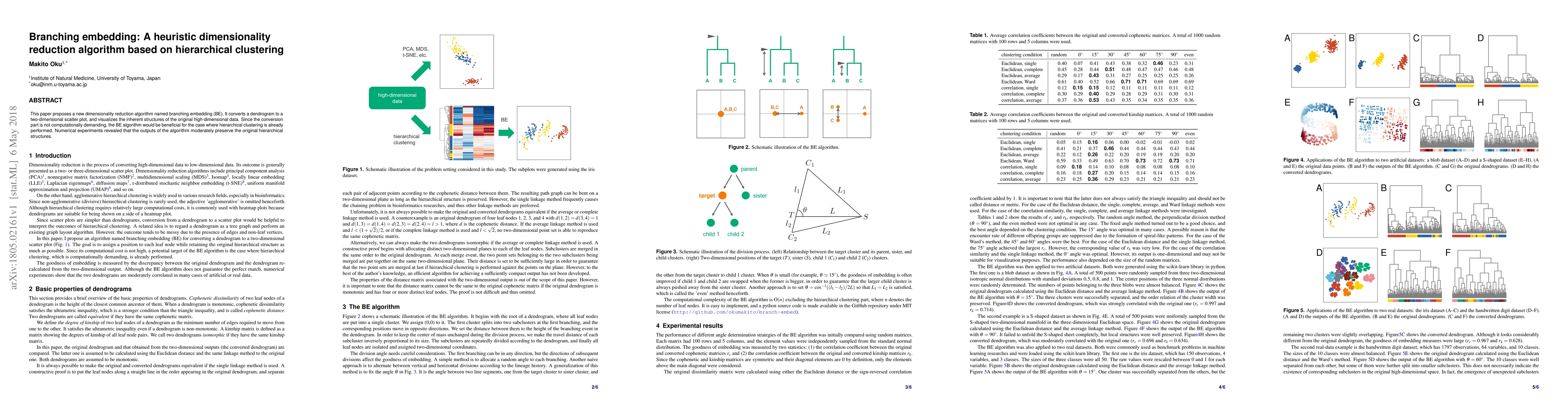 The paper introduces branching embedding (BE), a heuristic dimensionality reduction algorithm based on hierarchical clustering, which converts dendrograms into two-dimensional scatter plots to visualize high-dimensional data structures. Numerical experiments show that BE moderately preserves the original hierarchical structures with minimal computational demand.